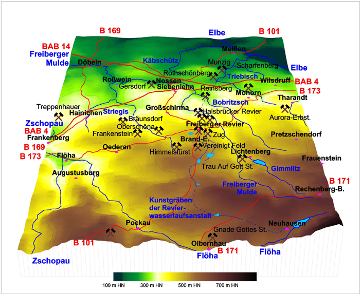 Regionales aus dem Freiberger Revier: Auch hier eine Übersichtskarte vorweg: Das Altenberger Revier mit Seiffen, Glashütte und Lauenstein gehörte zuletzt ebenfalls dazu, aber das würde nun weiß Gott zu umfangreich für ein "Revier".