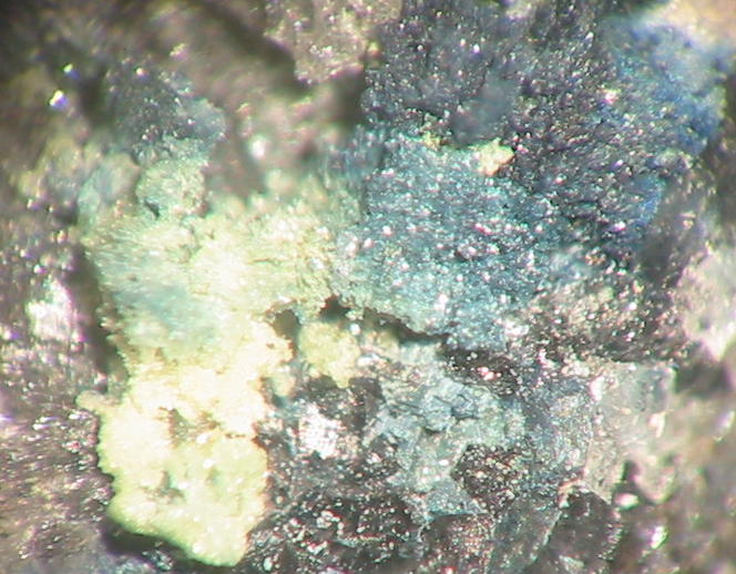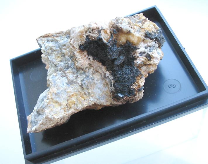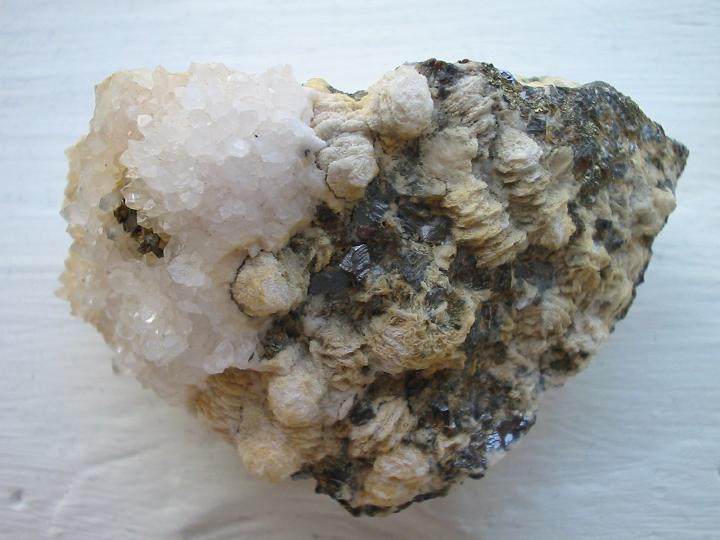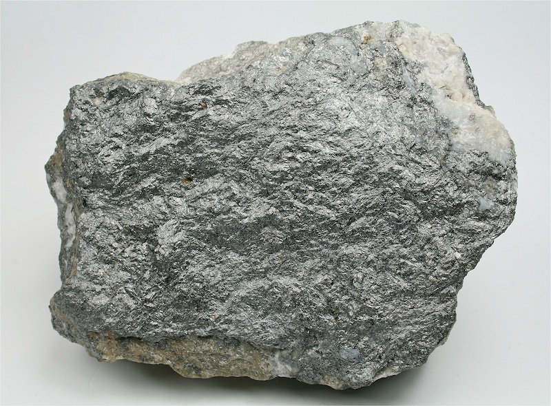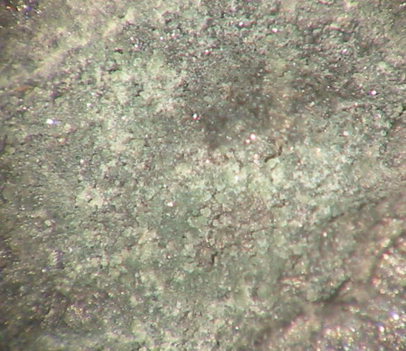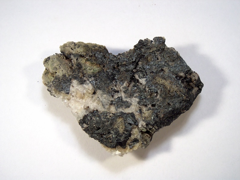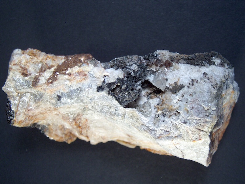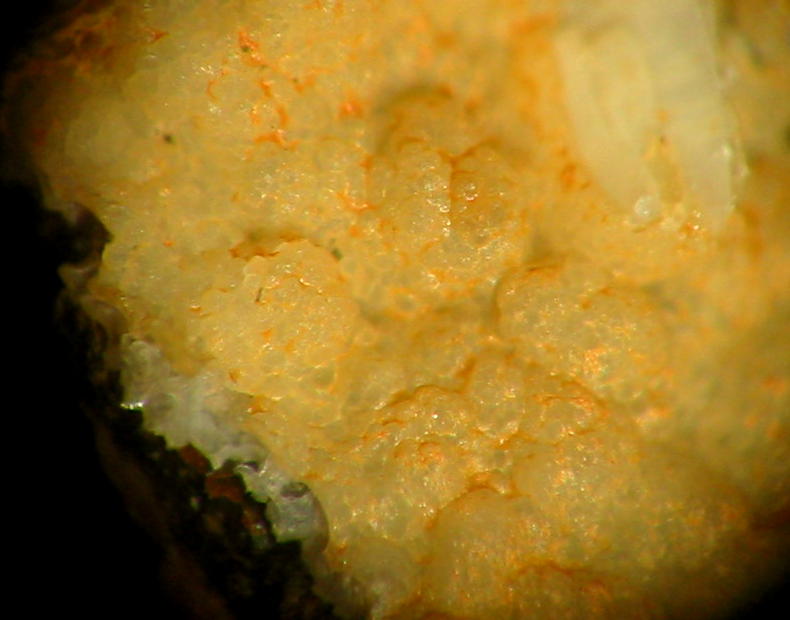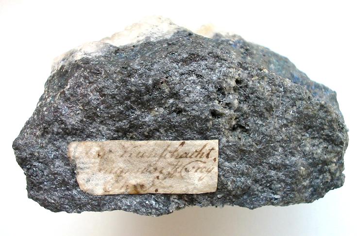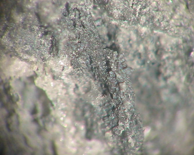Weißer Anflug auf derbem Sphalerit-Erzstück aus dem „Huthausschacht“ bei