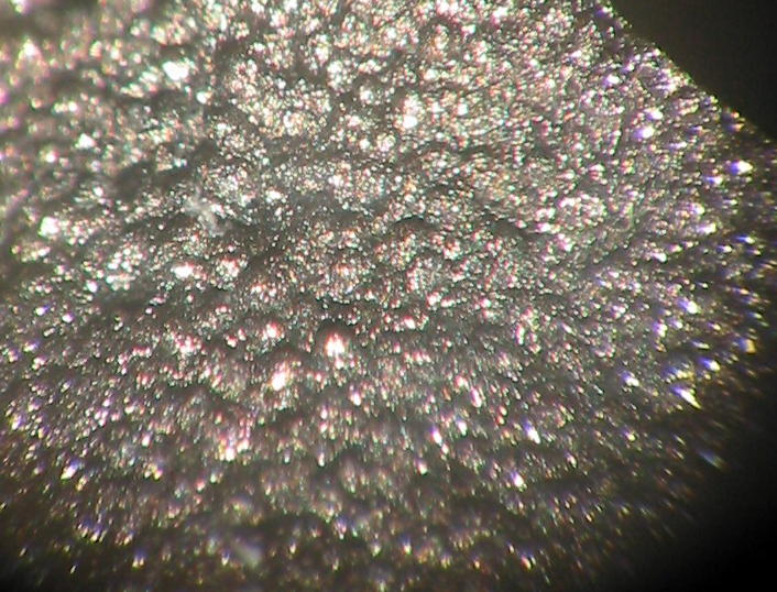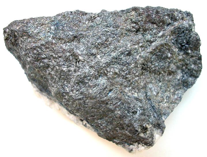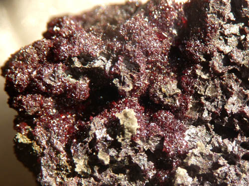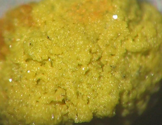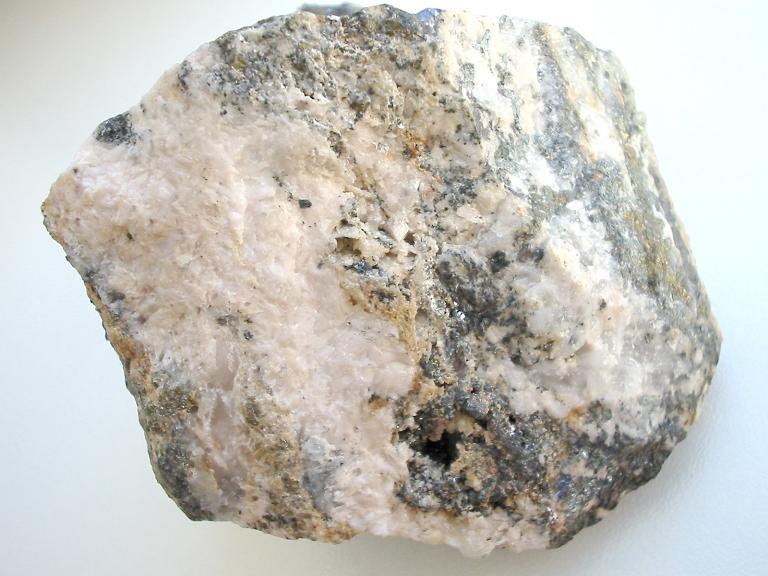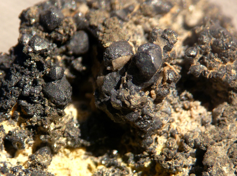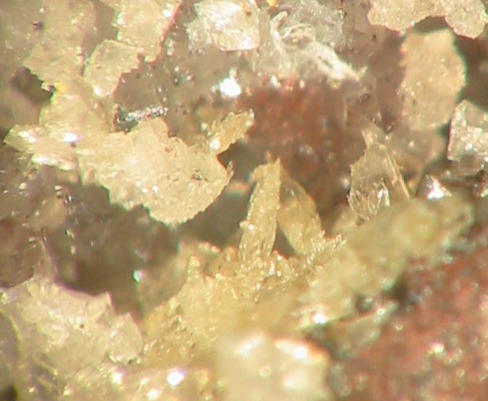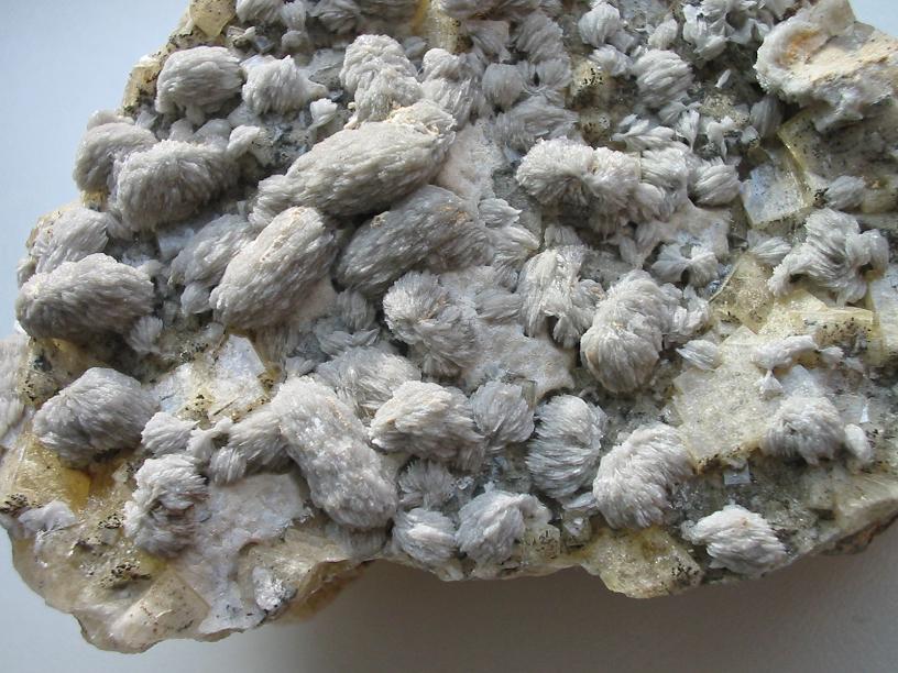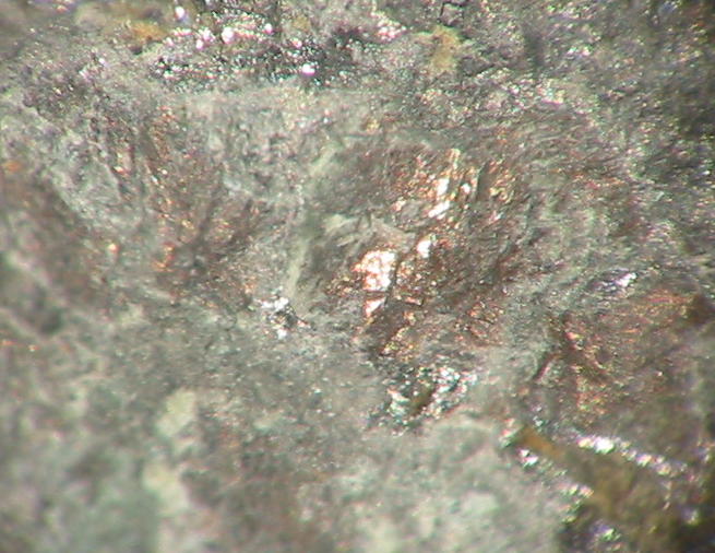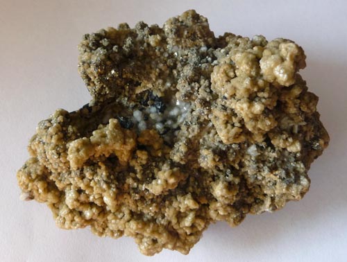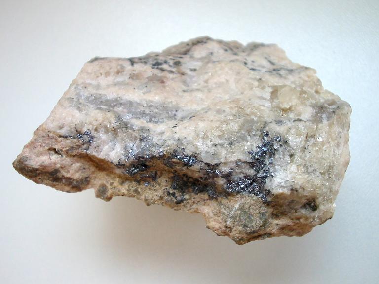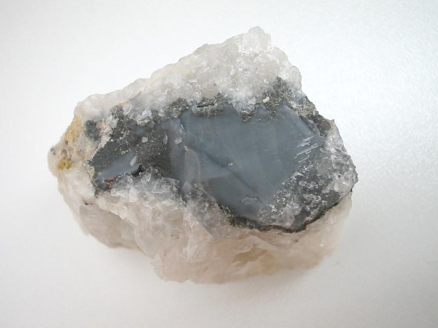 Weißer Anflug auf derbem Sphalerit-Erzstück aus dem „Huthausschacht“ bei