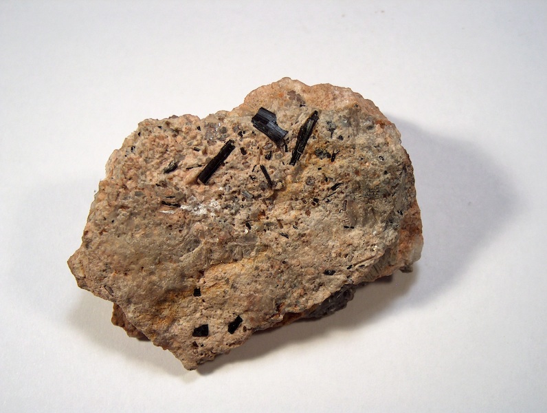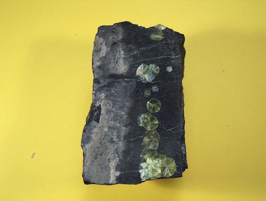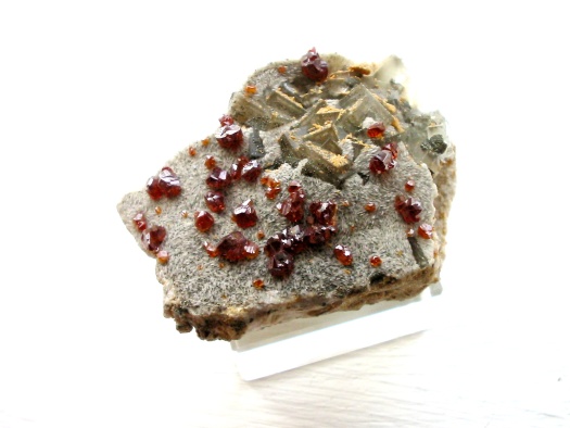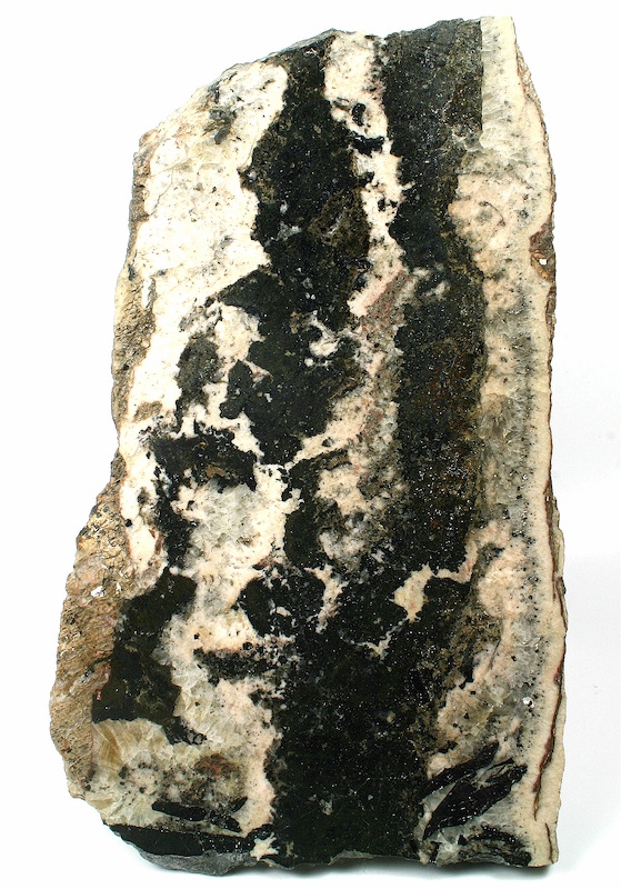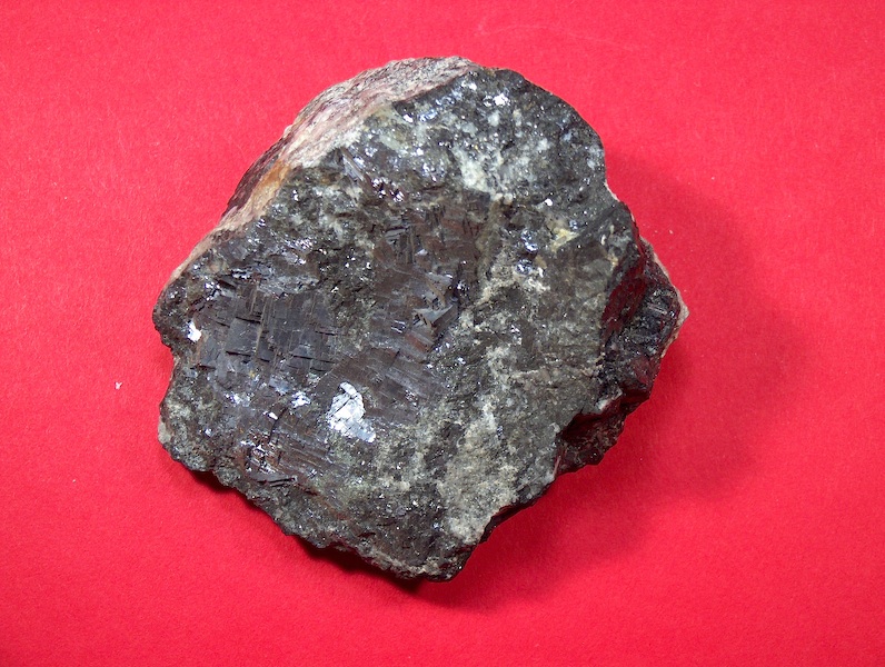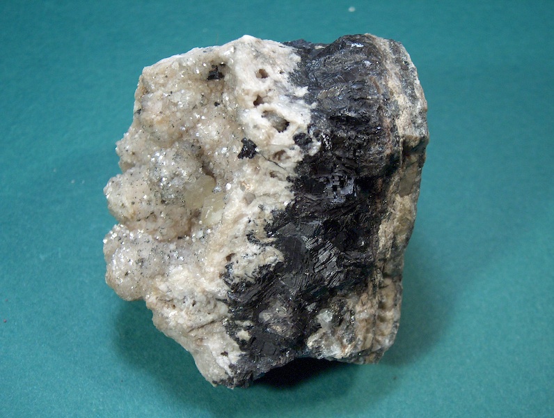 und Antimonit auf Nebengestein, als halbes Gangstück in Längsbruch,