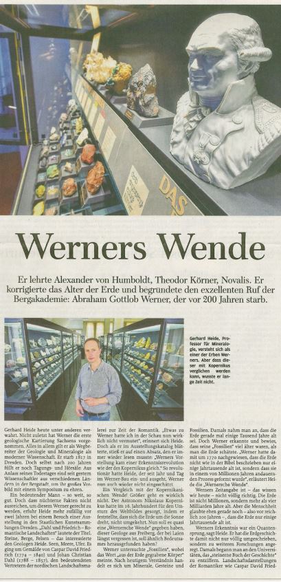 Bereits zu Lebzeiten galt Abraham Gottlob Werner als Schöpfer eines neuen geologischen Weltbildes auf wissenschaftlicher Grundlage. Zu seinem 100. Todestag widmete die Bergakademie in ihrer Jahrbuch-Ausgabe von 1917 A. G. Werner eine fast 50seitige Publikation, in der der Geheime Bergrat und Professor der Bergakademie Richard Beck seine Verdienste auf´s umfassendste würdigte. Die staatliche Bergwirtschaftsstelle des Oberbergamtes gab zu diesem Anlaß sogar eine Gedenkmünze heraus (40028, Nr. 3-781). An den Kreuzteichen vor dem früheren Stadttor, direkt an der Wallstraße, über die heute die B 101 verläuft, steht ein Denkmal für Werner, entworfen von Eduard Heuchler.