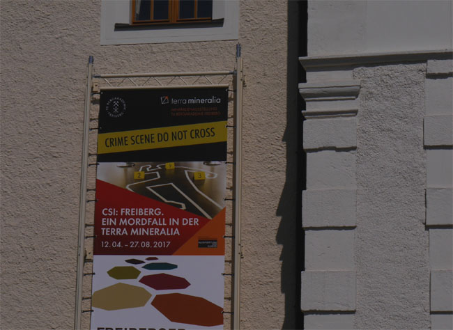 ![]() Aber offenbar ist auch hier nichts unwillkommen, was der „Vermarktung“ dieser Ausstellung zuträglich sein könnte. Das treibt neuerdings tolle Blüten: Wer bitte fährt denn in ein Museum (so es sich nicht gerade um die Sammlung des kriminaltechnischen Institutes handelt), um dort fiktive Mordfälle zu lösen? Liebe Ausstellungsmacher: Ihr hattet schon bessere Ideen, z. B. die Angebote zum Selber-Forschen für junge „Mineralinos“… Deshalb und auch, weil inzwischen die Gerüste am Gebäude gefallen sind, wollen wir nun auch einmal Teile der wissenschaftlichen Sammlungen der Bergakademie – auch da ist ja bei weitem nur ein kleiner Teil des gesamten Fundus in der Ausstellung zu sehen – in unseren Rubriken „Mineralisches“ und „Baudenkmale“ vorstellen.