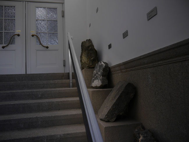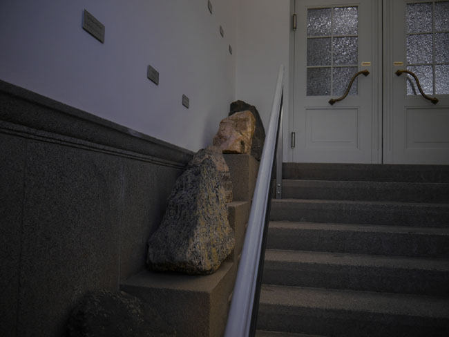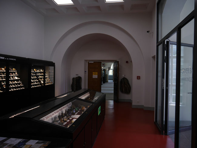 Geradeaus geht es durch dieses besonders historisierend geschmückte Portal in die petrologische Sammlung. Im Foyer befinden sich außerdem mehrere Vitrinen für wechselnde Sonderausstellungen.