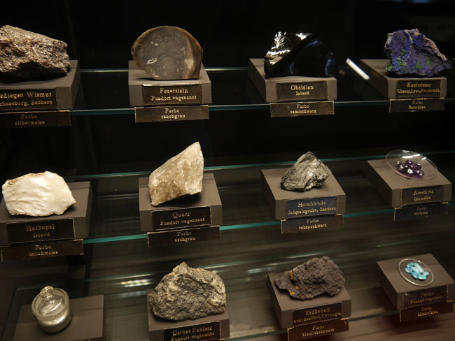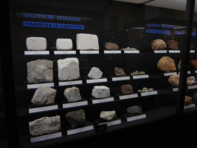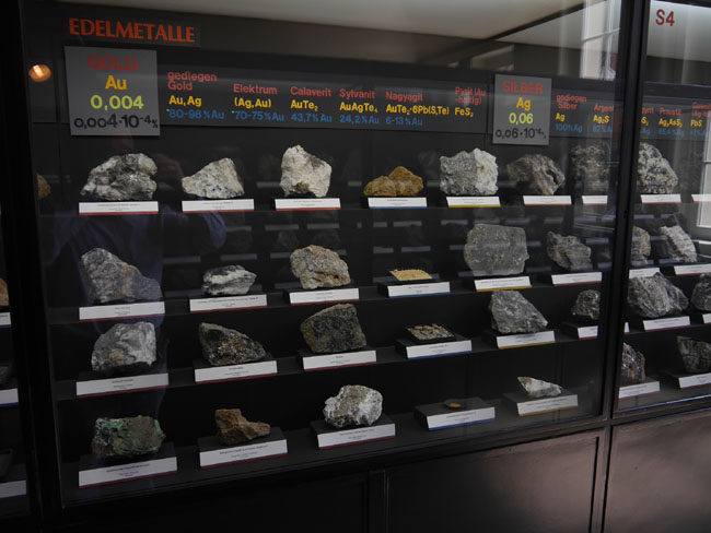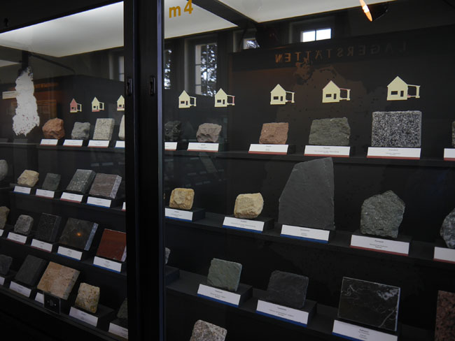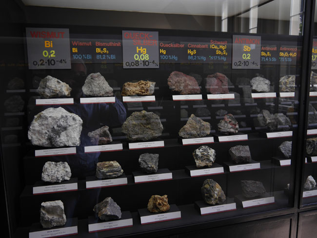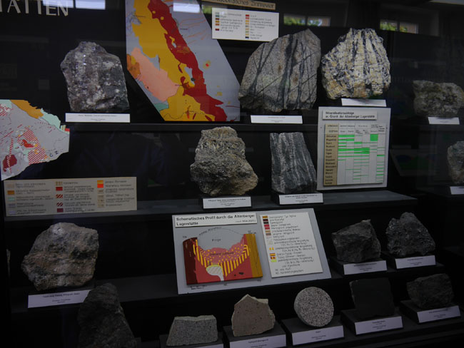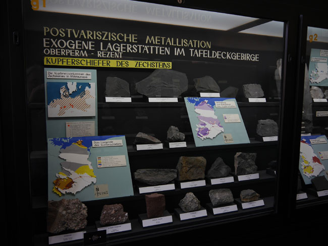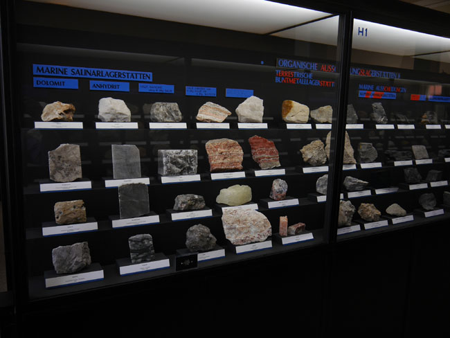 Nun geht es in die gegenüber an der anderen Giebelseite liegenden Ausstellungsräume. Hier steht die lagerstättenkundliche Sammlung und die sollte man sich unbedingt auch einmal zu Gemüte führen.