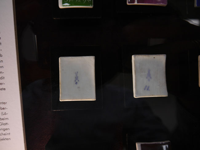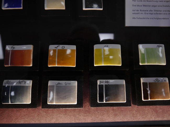 In den Mittelvitrinen findet man gegenwärtig auch solche Porzellantäfelchen für den Farbvergleich und staunt, daß es nicht nur vom Grau fifty shades gibt...