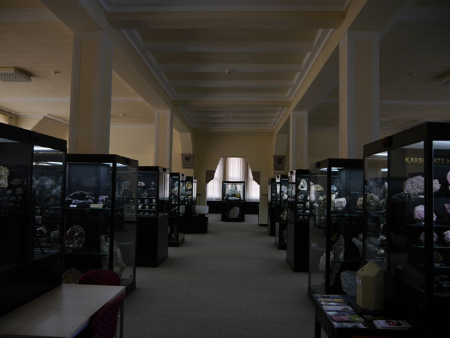 Schauen wir aber nun zuerst nach links in die systematische mineralogische Sammlung – wo sich im Übrigen auch die Kasse befindet – entrichten unseren Obolus (zur Zeit 2,50 Euro) und staunen zunächst einmal über die Größe des Raumes, die man dem Gebäude, von außen betrachtet, gar nicht zugetraut hätte. |