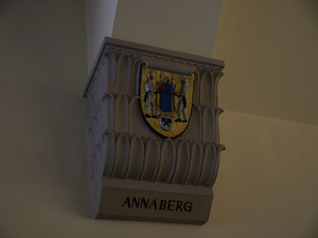 Die Kämpfer, auf denen die Längsträger der Decke und die Türgewände aufliegen, sind mit den Wappen der Bergstädte geschmückt. Neben Annaberg finden sich im östlichen Ausstellungsraum Marienberg, Schneeberg, Altenberg, Ehrenfriedersdorf und Geyer, die beiden letzteren einander gegenüber unter dem Türsturz des Durchgangs in den angrenzenden Saal am Ostgiebel.