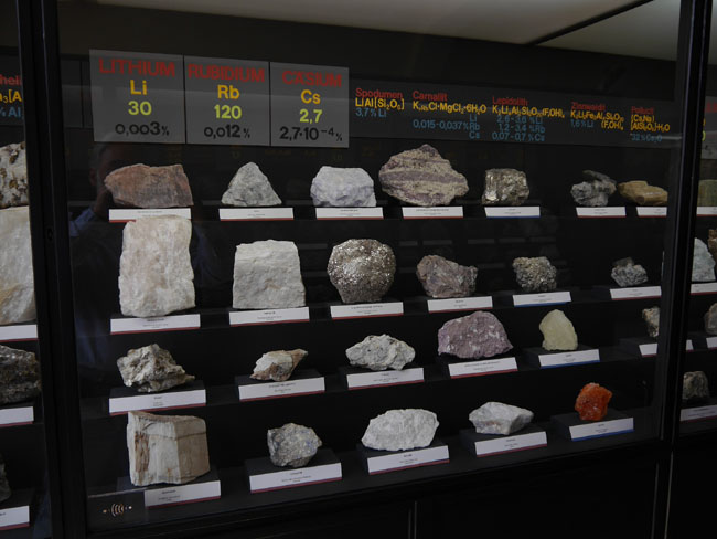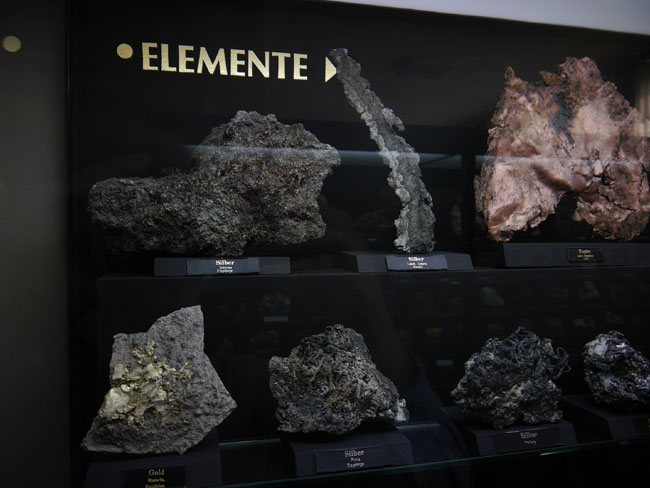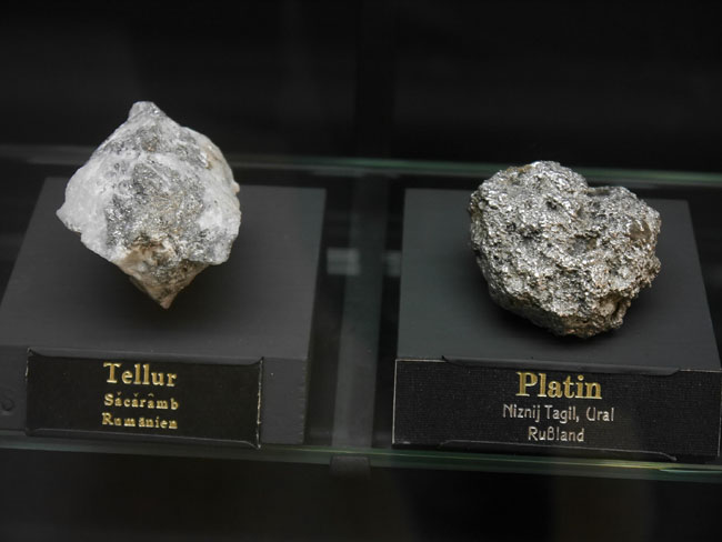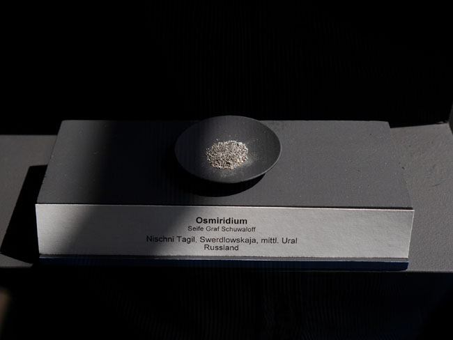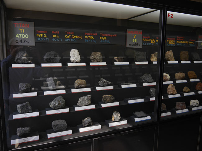 Titan, Vanadium, Wolfram, Molybdän usw. usf. … Die Zahlen unter dem Symbol des Elementes in der Vitrine geben übrigens den Clarke-Wert an, also die relative Häufigkeit in der Erdkruste.