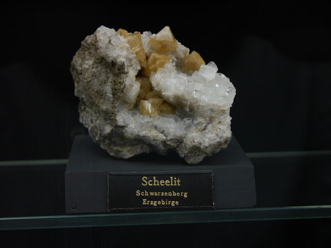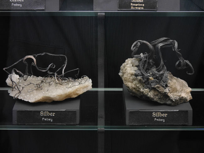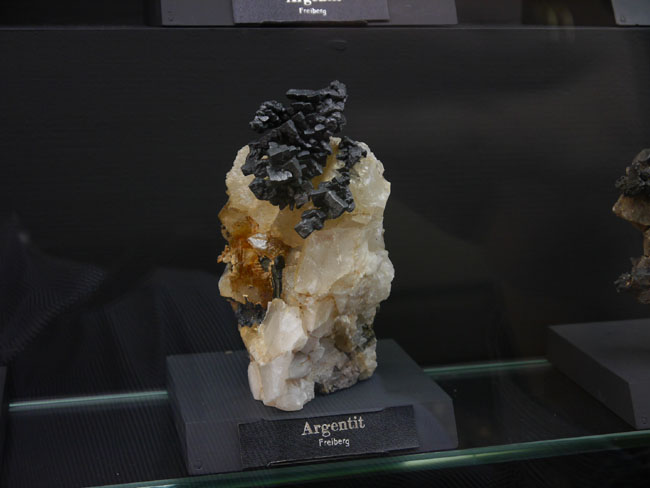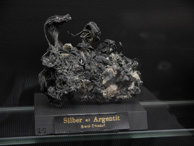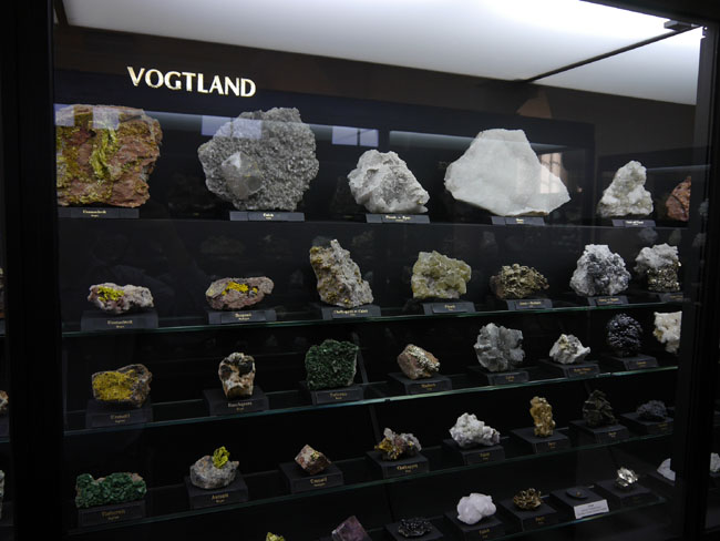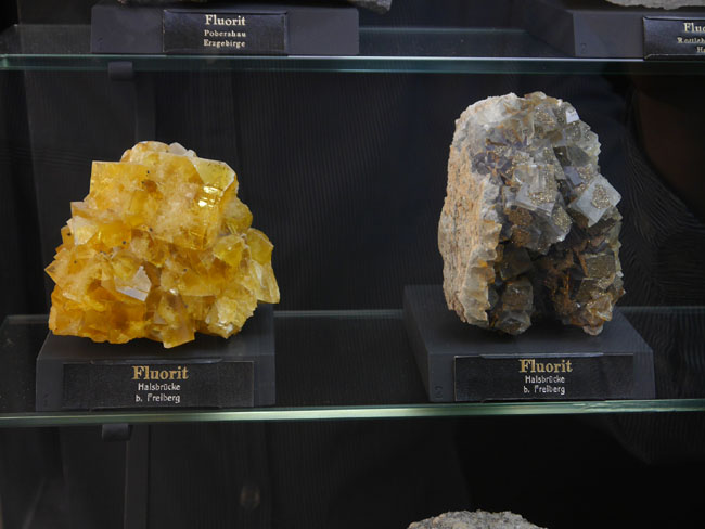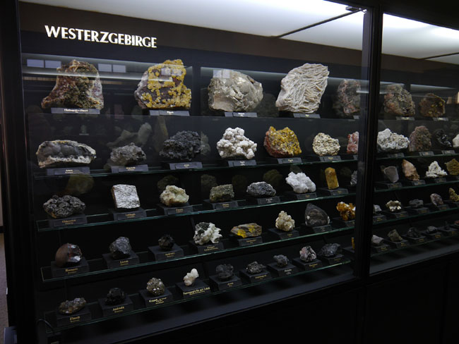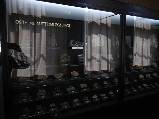 Wir hoffen jedenfalls, daß wir unsere Leser mal wieder zu einem neuen Besuch in diesen alten Sammlungen verlocken konnten. Als die älteste Mineralsammlung am Platze hat sie sicherlich fast jeder, der sich für Geowissenschaften interessiert, ohnehin schon einmal besucht. Nach der Gebäudesanierung hat sich aber nicht nur die technische Ausstattung für die Studenten und die Sicherheit im Brandfall verbessert – auch in den Ausstellungsvitrinen selbst scheint mir seit meinem letzten Besuch einiges „museumspädagogisch“ modernisiert worden zu sein. Nur eines: Die Fotoerlaubnis ist hier inzwischen genauso teuer wie in der „terra mineralia“ (nämlich 3,- Euro). Auch wenn die Sonne nicht von außen scheint, bewirken die Deckenleuchten aber zu viel Nebenlicht und zu viele Spiegeleffekte, als daß man als fotografischer Laie gleichermaßen gute Fotos hinbekommt, wie in der Schausammlung im Schloß. Diese Gebühr zu zahlen, lohnt sich also kaum. Man mag sie aber gern als Spende für die Erhaltung und den Ausbau der Sammlungen verstehen und es trotzdem mit eigenen Fotos versuchen – als Mineralfreund kommt man doch eh´ an vielen schönen Stufen einfach nicht vorbei, ohne zumindest ein Erinnerungsfoto zu versuchen… Glück Auf! J. B.
