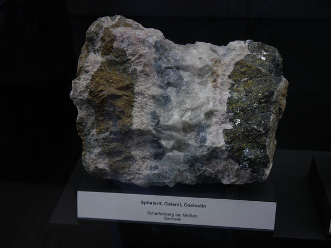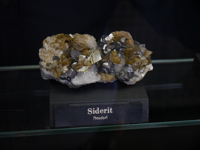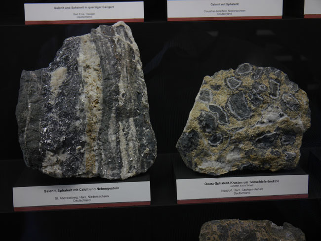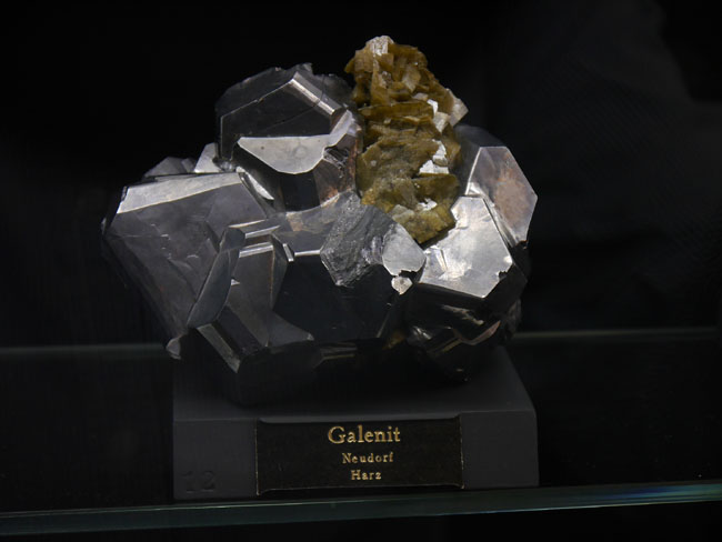 Dann gibt´s hier noch Vitrinen zu Thüringen und dem Harz, wo wir die schönen Galenit- Kristalle vom Neudorfer Typ, zusammen mit dem hier braun- durchscheinenden Siderit (FeCO3) wiedersehen…