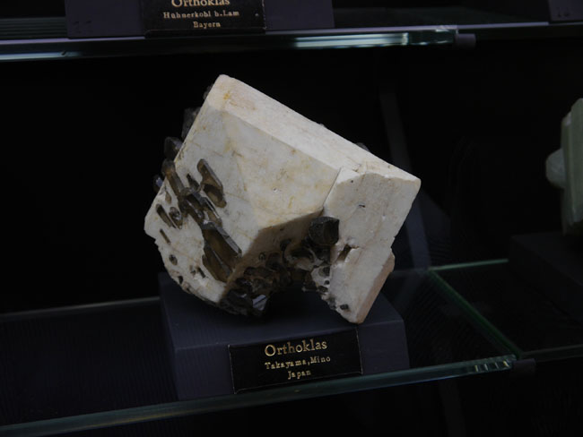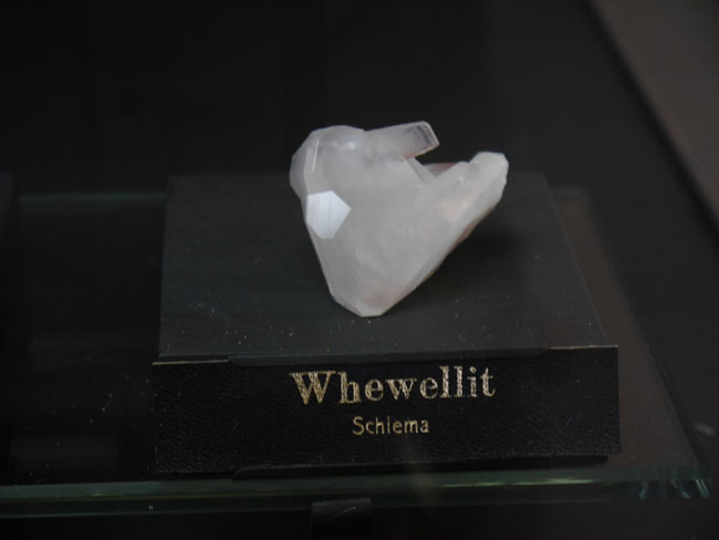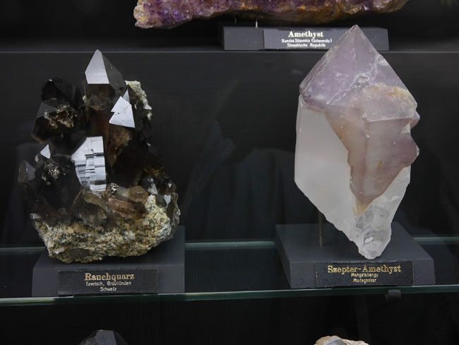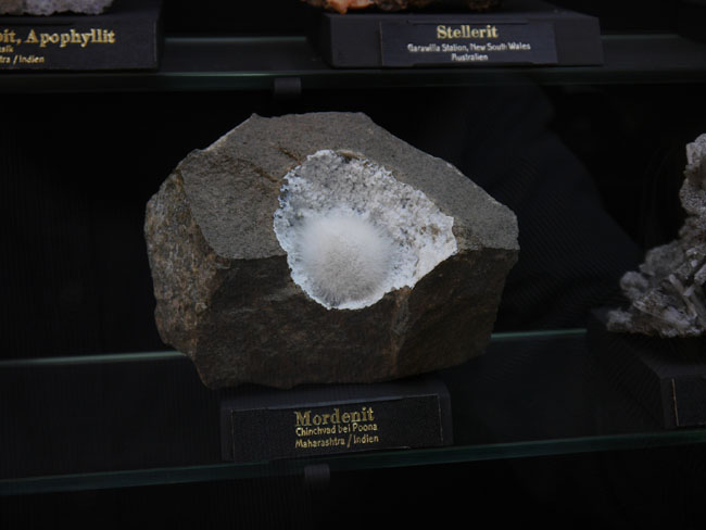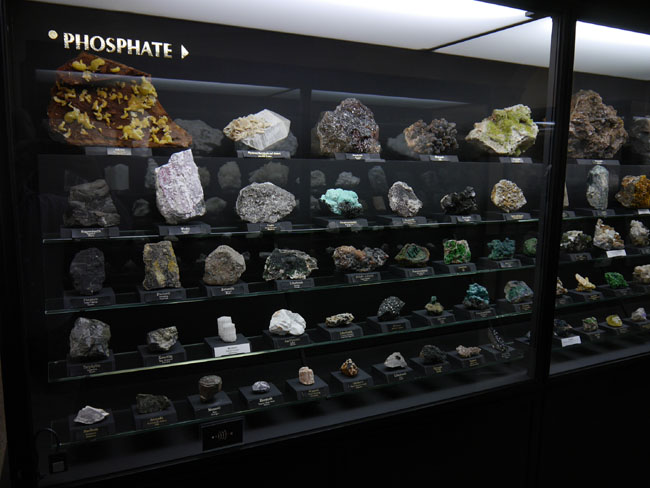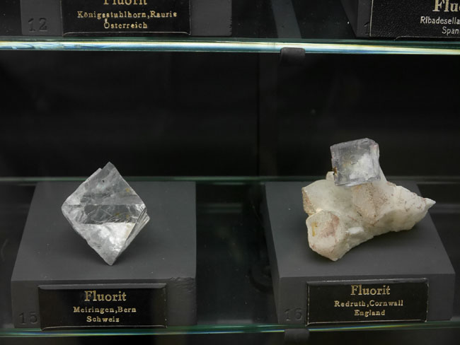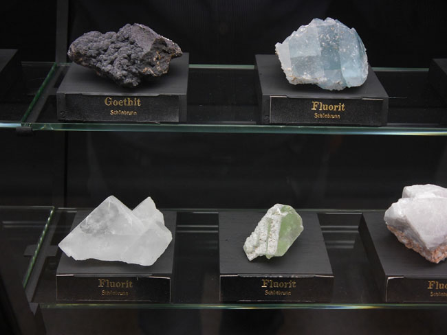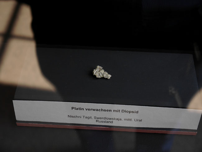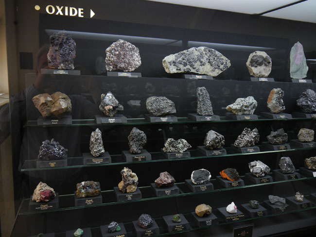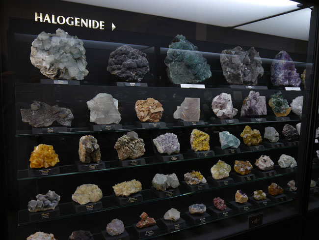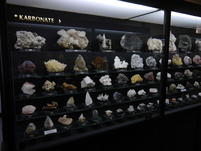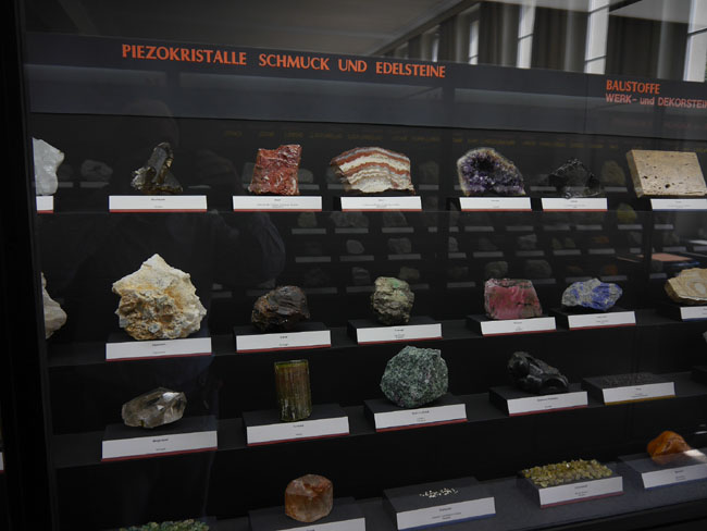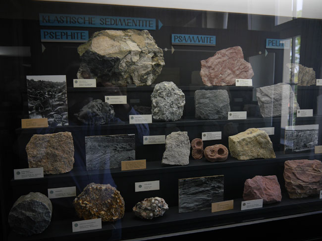 Das war nun schon eine Menge „Augenschmaus“. Aber es geht ja noch weiter… Die beiden anderen Sammlungen sind tatsächlich eher etwas für den Geologie-Studenten. Hier stehen nämlich nicht die seltenen Einzelfunde besonders schöner Mineralien, sondern die „Steine“ – die natürlich alle aus eben diesen Mineralien aufgebaut, aber doch zumeist vorallem dicht und hart und grau erscheinen, solange man sie nicht in dünne Scheiben zersägt und unter dem Polarisationsmikroskop betrachtet. Aber das können die Studenten in den freilich normalerweise nicht öffentlich zugänglichen Laboratorien im Untergeschoß hier ja auch tun… Durch die erste gehen wir mal schnell durch, zumal inzwischen die Sonne halb herum ist und sich die Außenfenster wieder in den Vitrinen spiegeln.