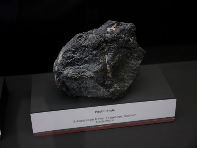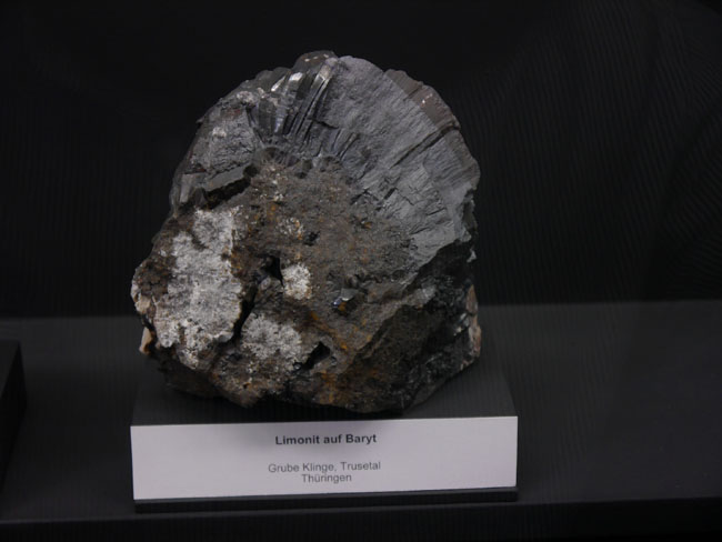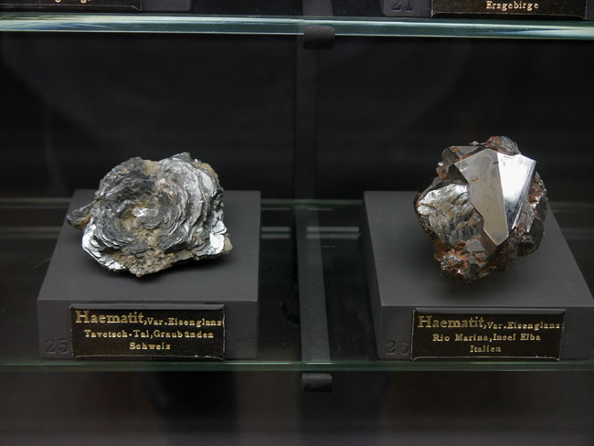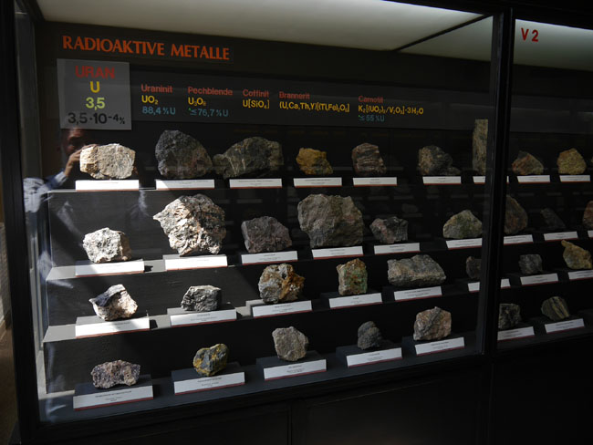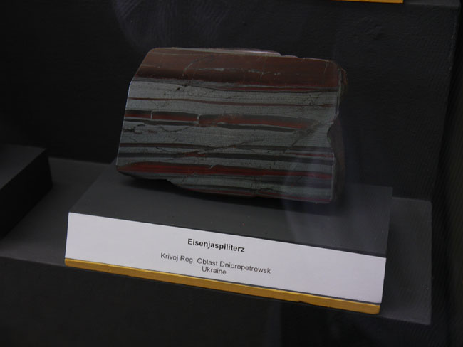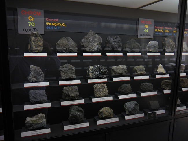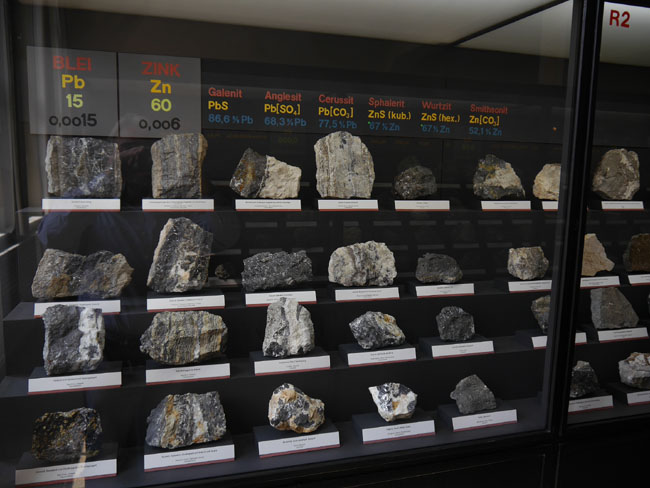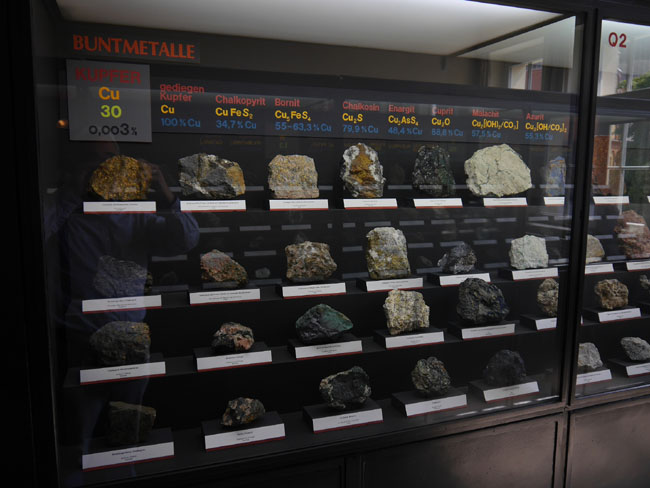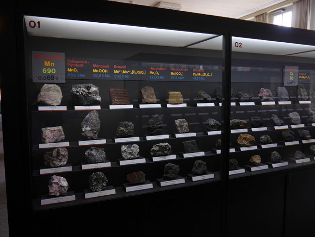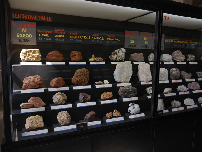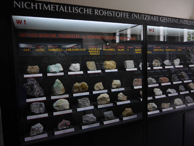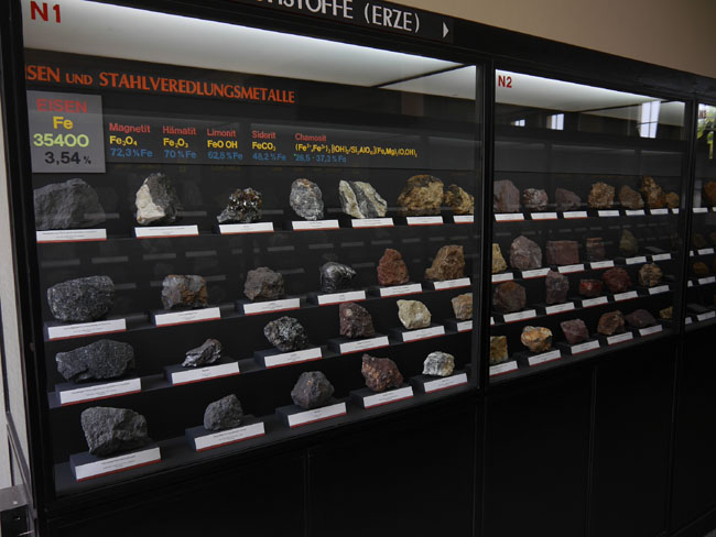 Dann gibt´s hier noch eine andere hochinteressante Zusammenstellung: Die Vitrinen an der linken Seite des Saales nämlich sind danach geordnet, welche Rohstoffe man denn daraus gewinnt. Das beginnt mit einem unserer wichtigsten Baustoffe: Dem Eisen.