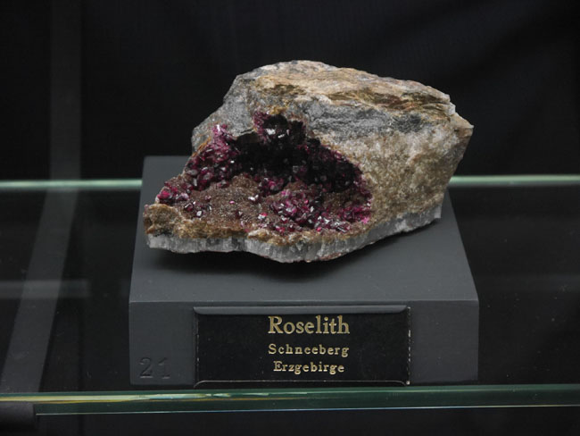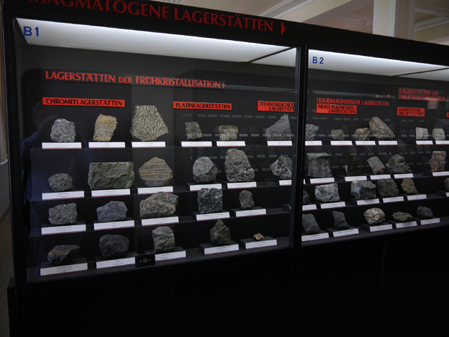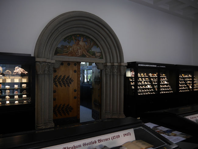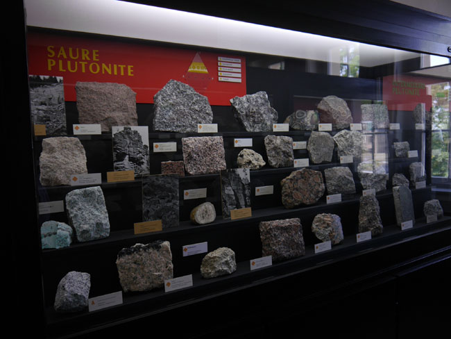 Hinter der mittleren Tür verbirgt sich die petrologische Smmlung. Die ist natürlich nicht mehr nach Werner´s Klassifikation geordnet, sondern nach modernen geologischen Vorstellungen. Zur leichteren Orientierung hat man die magmatischen Gesteine mit roten Tafeln gekennzeichnet…