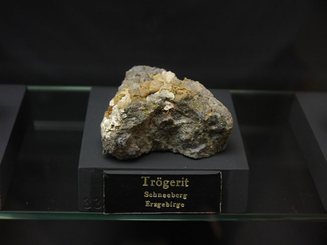 Auch diese eigentlich recht unscheinbare Stufe müssen wir unbedingt zeigen, weil sie wohl schon aus dem „Jahrhundertfund“ vom 16. März 1871 auf dem Walpurgis Flachen in Schneeberg stammt und zusammen mit vier weiteren Neuentdeckungen vom Bergmeister Tröger zur Bestimmung nach Freiberg geschickt wurde. In Schneeberg wurden insgesamt (bisher) 22 neue Mineralien entdeckt, darunter recht seltene, wie eben dieses Uranyl-Arsenat mit der Zusammensetzung (H3O)(UO2)(AsO4) • 3 H2O.