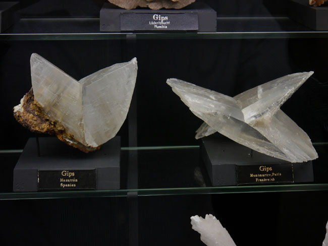Ganz „triviale“ Minerale gehören aber auch in diese Gruppe, wie der Gips (CaSO4 • 2 H2O) mit seinen schönen „Schwalbenschwanz-Zwillingen“.