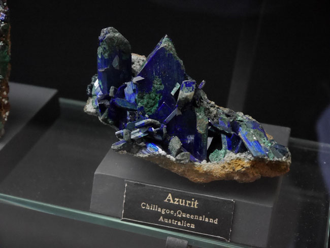 Und auch bei solchen prächtigen Kristallen schlägt des Mineralogenherz immer wieder schneller: Das Kupfer-Karbonat Azurit Cu3(CO3)2(OH)2.