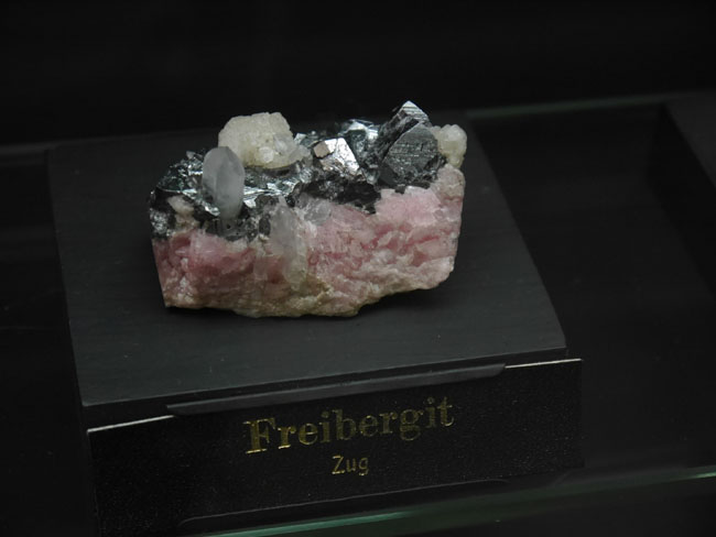 Den hatten wir auf unseren Fotos aus der systematischen Sammlung auch noch nicht vorgestellt: Freibergit gehört zu den Fahlerzen und wird etwa mit dieser chemischen Zusammensetzung angegeben: (Ag, Cu)10(Zn, Fe)2(As, Sb)4S13.