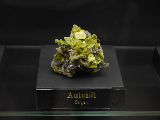 …wo wir überrascht wieder vor schicken Stufen der Uranyl-Salze vom Streuberg-Steinbruch in Bergen stehen, hier der Autunit, chemisch das Kalzium-Uranyl-Phosphat Ca(UO2)2(PO4)2 • 10-12 H2O.