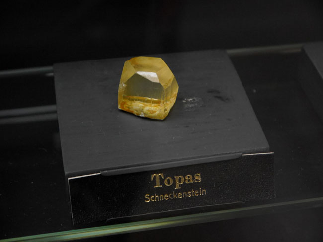 Nicht zu vergessen: Der Schneckenstein-Topas Al2SiO4(F, OH)2 mit seiner typisch weingelben Farbe.