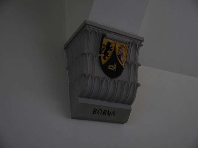 …Borna! War mir gar nicht bewußt, daß diese Stadt Bergrechte besessen hat – aber die Kohle hatte wohl zur Zeit der Errichtung dieses Gebäudes dem Erz schon den Rang abgelaufen… Außerdem findet man hier noch die Wappen von Schwarzenberg, Eibenstock, Johanngeorgenstadt und Zwickau.