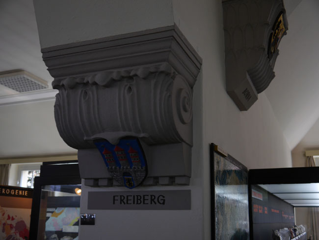 Wir springen gleich einmal hinüber in die lagerstättenkundliche Sammlung auf der Westseite des Dachgeschosses und finden hier auch das Wappen der alten Bergstadt Freiberg, allerdings unterhalb des Wappens von…