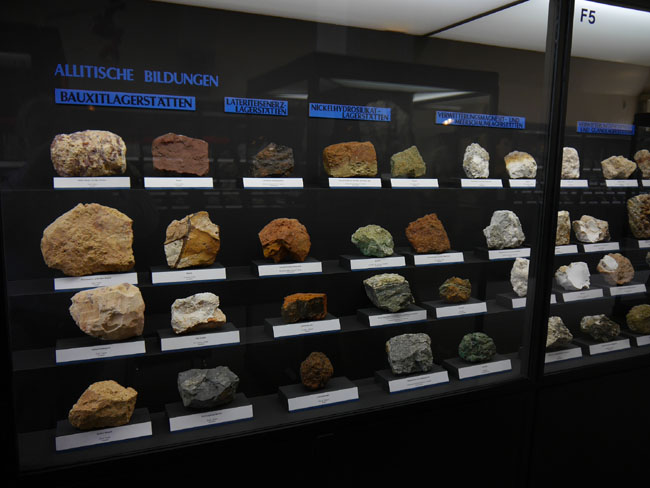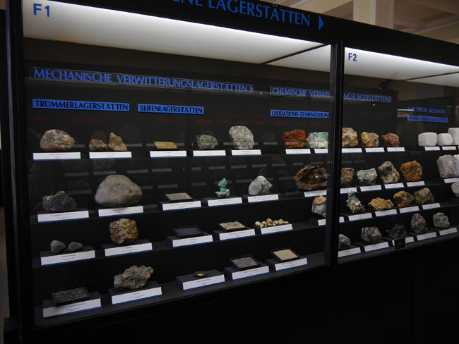 Dann hätten wir die durch Verwitterung entstandenen Lagerstätten, analog wie zuvor nun kenntlich gemacht durch die blaue Beschriftung der Vitrinen…
