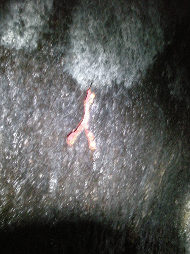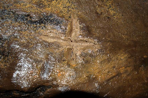 2012 haben wir im Viktor Stehenden rund 6 m südlich des Streckenkreuzes noch eines entdeckt (Nr. 13 im Grundriss oben im Text). Auch dieses weist am linken Stoß in Richtung Mundloch !