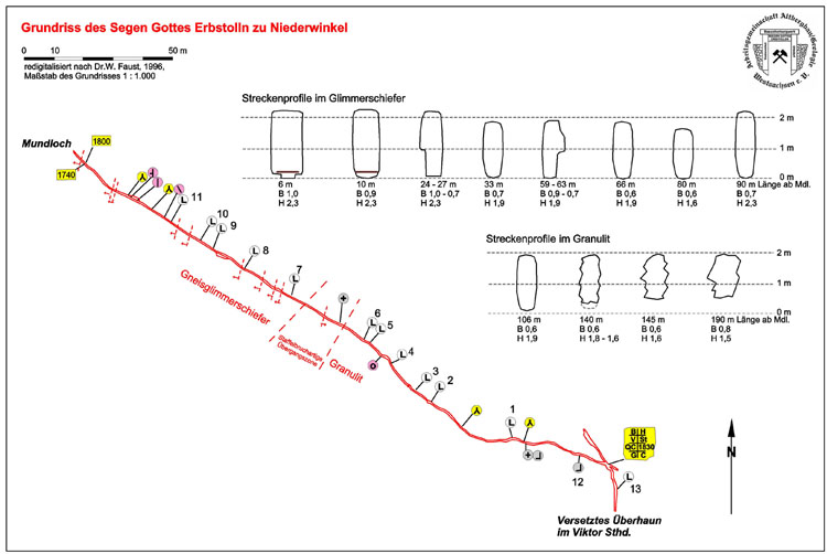 Im Weiteren wollen wir nun versuchen, die Zeichen zu lesen und zu entziffern, was die Vorfahren mit ihnen zu sagen beabsichtigten. Von Bedeutung erscheint zuerst die Lage der meisten Gedingezeichen im linken Stoße und deren Weisung zum Mundloche hin, was dem anderenorts Üblichen genau entgegensteht. Es muß daraus gefolgert werden, daß diese Zeichen nicht dem Vortrieb des Stollnortes, vielmehr dem Nachriß der Form und seiner Gangbarmachung gegolten haben müssen, wofür ferner auch die viel schnellere Arbeit – nach den Quartalswinkeln berechnet – spricht. Beim Nachriß der Kontur sind vielleicht vorher vorhandene, dem Vortrieb geltende Winkel und Gedinge sicherlich zerstört worden, wurden sie doch zu diesem Zeitpunkt auch schon nicht mehr benötigt. Zugegebenermaßen waren die Alten höchst sparsam, dem Stolln auch im harten Granulit eine gut fahrbare Kontur zu geben – hier haben sie wohl eher die Form nur berissen, statt wirklich auf übliche Maße nachgerissen, was anhand der Profilskizzen in Abbildung 5 gut zu sehen ist. Dem unregelmäßigen Ausbruch des massigen Granulits folgend, ist die Kontur hier zwar meistens breiter als im Glimmerschiefer, jedoch wurde der Stolln mit gerade einmal 1,5 m bis 1,6 m Höhe aus dem Granulit herausgeschossen. Im Glimmerschiefer hingegen wurde die Kontur höchst säuberlich ausgearbeitet und auf eine – auch bei eingebautem Laufwerk über der Sohle – bequem aufrecht zu fahrende Höhe um einen Lachter schwankend erweitert. Wir maßen zwischen 1,9 m und 2,3 m; nur in einem kurzen Abschnitt zieht die Firste auf 1,6 m Höhe ein. |
