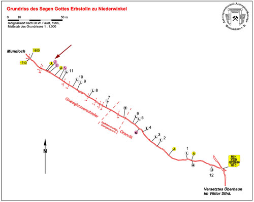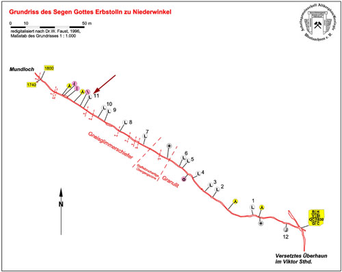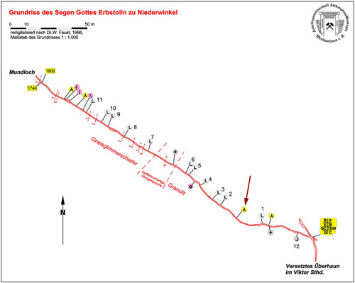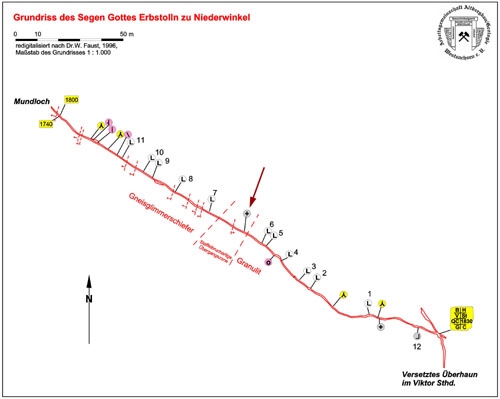 Im Folgenden eine Zusammenstellung aktueller Bilder der Gedinge und Zeichen im Segen Gottes Erbstolln. Die Zeichen werden vom Mundloch bergwärts angeführt, in der kleinen Karte zeigt der Pfeil den jeweiligen Standort. Alle Bilder sind relativ systematisch mit dem Mundloch im Rücken aufgenommen, so daß man gleich sieht, daß uns die Quartalswinkel "entgegen kommen". Die Zusammenstellung wird bei nächster Gelegenheit noch einmal vervollständigt und erweitert.
