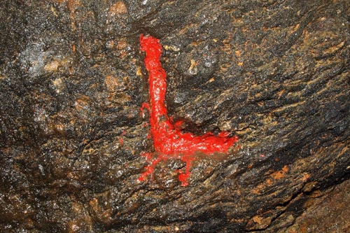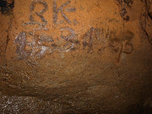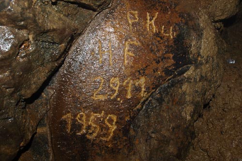 ![]() Ein paar eingekratzte Inschriften belegen, daß der Stolln Anfang der 1960er Jahre noch fahrbar gewesen sein muß, bevor das Mundloch in sich zusammenstürzte. |