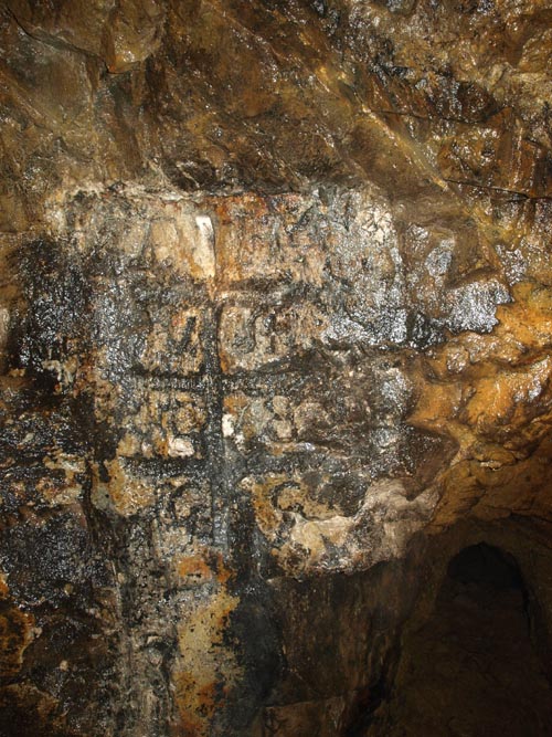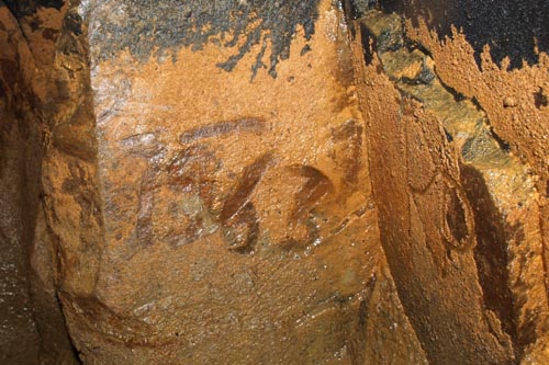 Schön anzuschauen sind erstens zwei Tafeln gleich am Mundloch links und rechts über Kopfhöhe in den Fels eingehauen und mit den Jahreszahlen 1740 und 1800 versehen.
