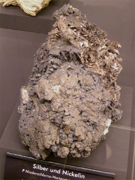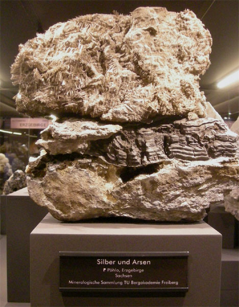 Silberdendriten (oben) auf schaligem Arsen (rechts am Salband).
