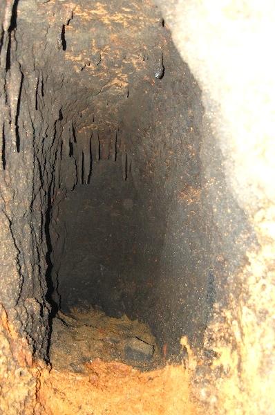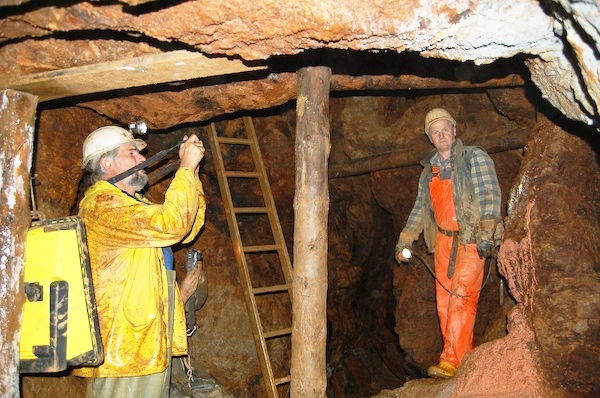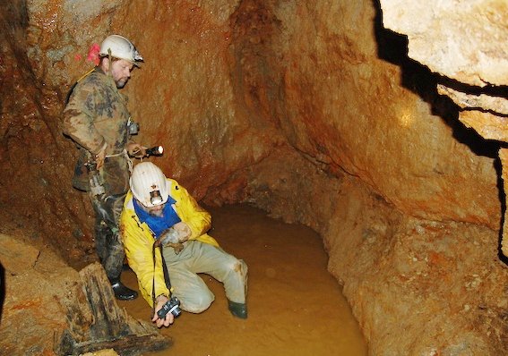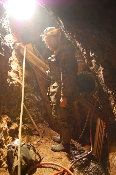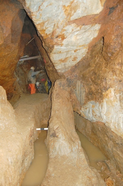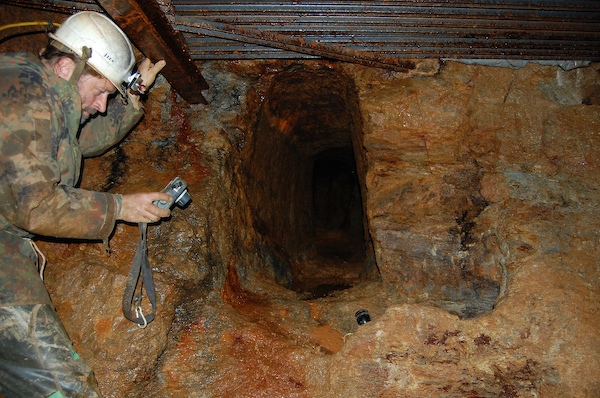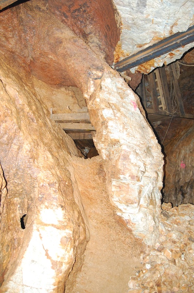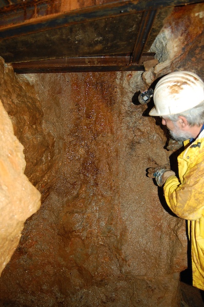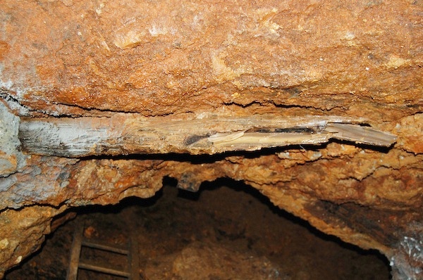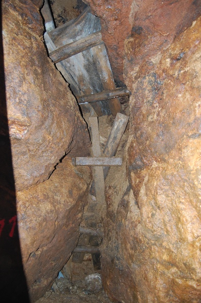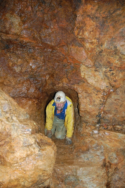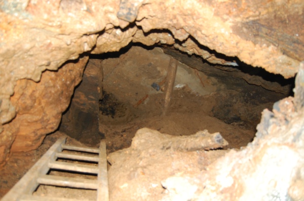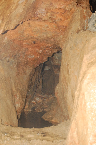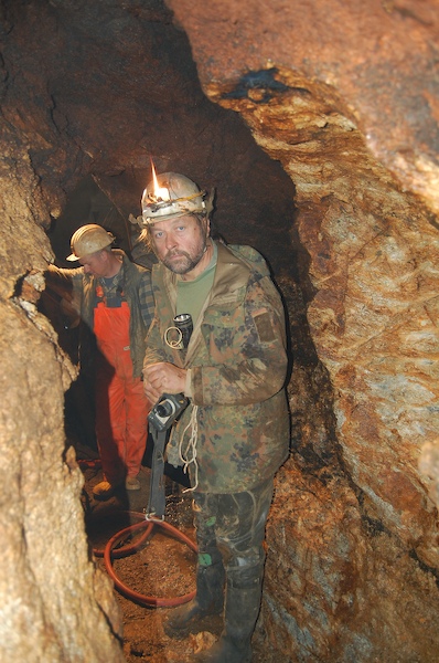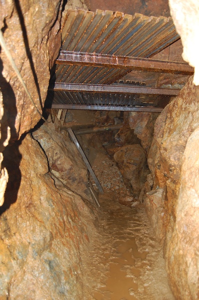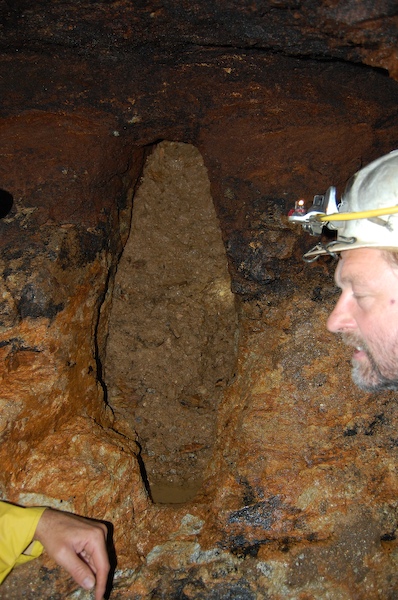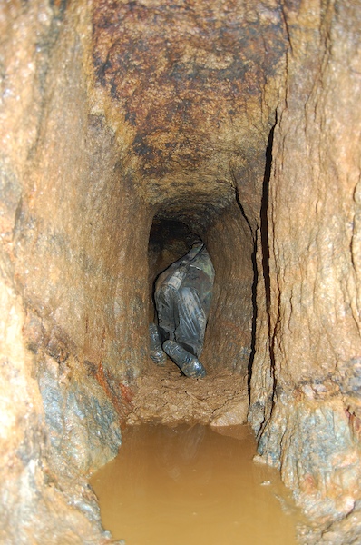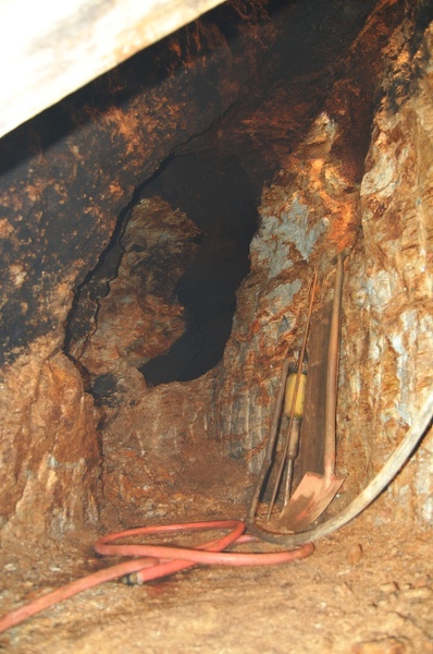 ![]() ...wiederholt Schächte oder Strossenbaue auffindbar. Überall haben die „Alten“ nach Erz geschürft und Hohlräume hinterlassen. Die Fahrt hinauf endet an einer kleinen versinterten Strecke. |