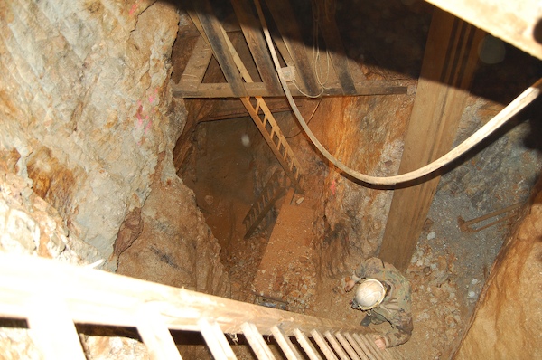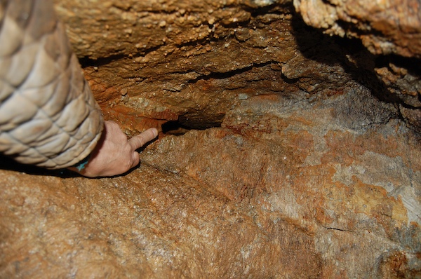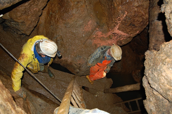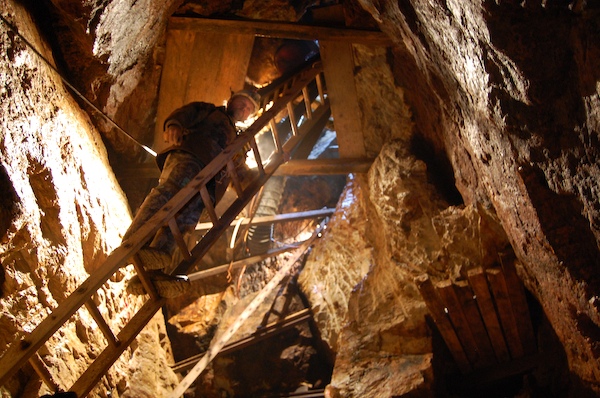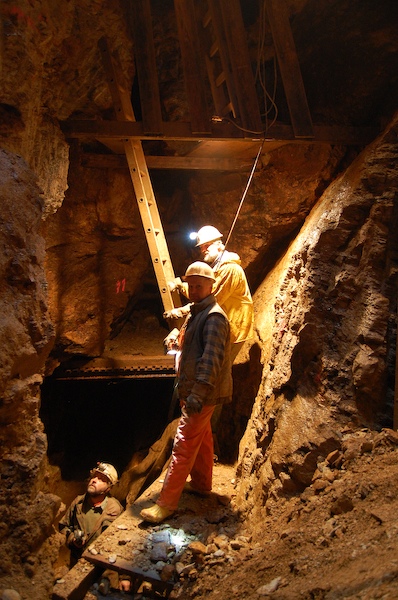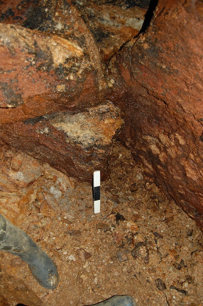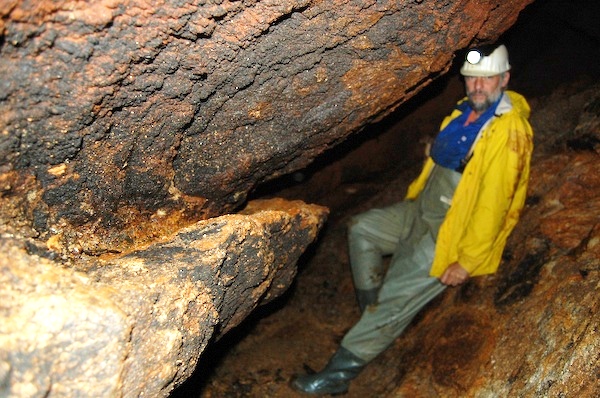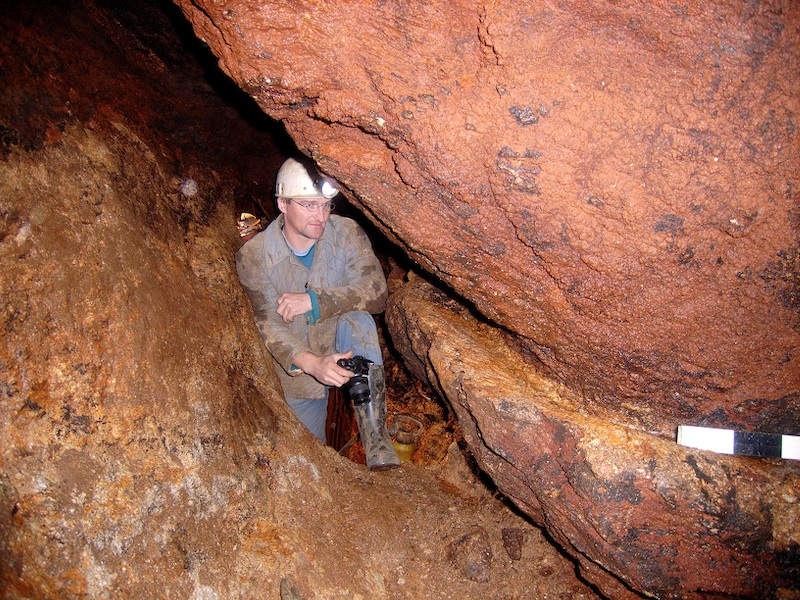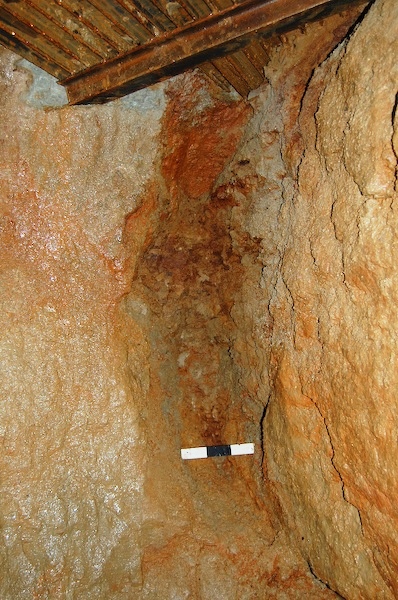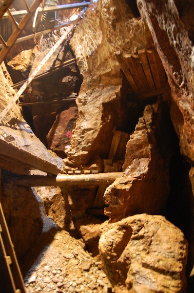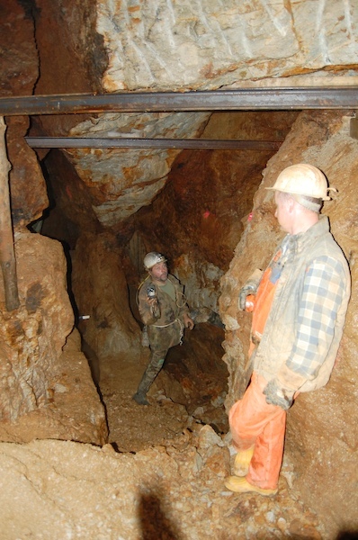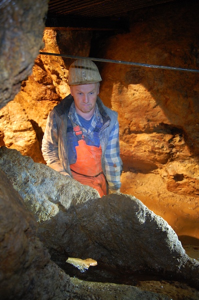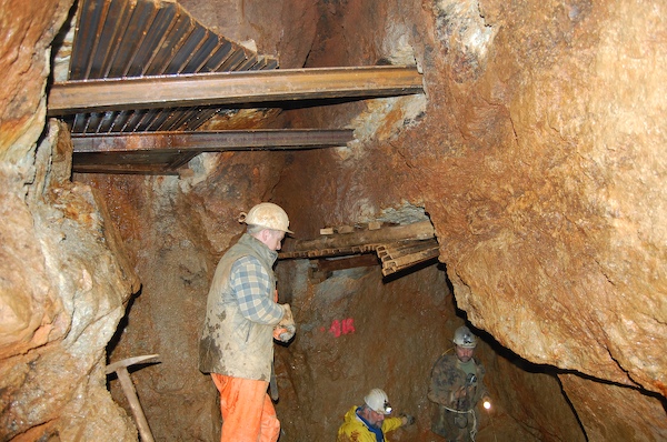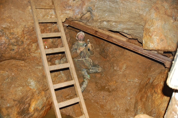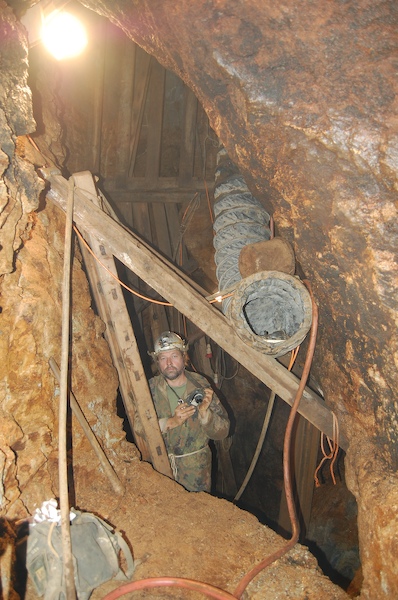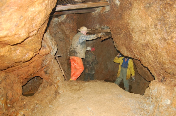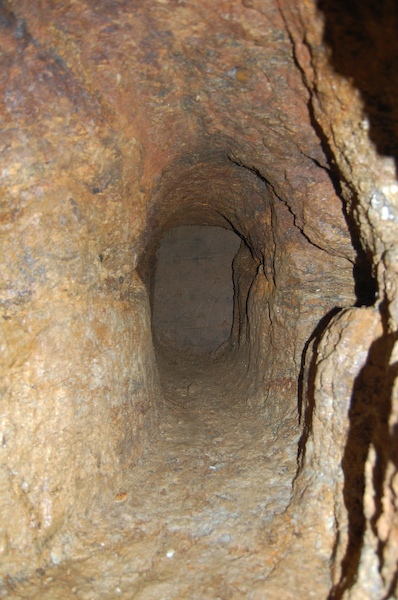 ![]() ...wiederholt Schächte oder Strossenbaue auffindbar. Überall haben die „Alten“ nach Erz geschürft und Hohlräume hinterlassen. Die Fahrt hinauf endet an einer kleinen versinterten Strecke. |