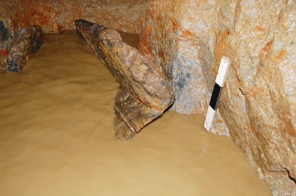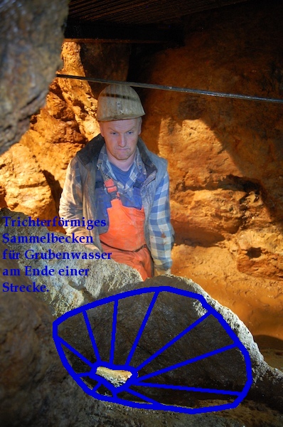 ![]() Ein weiterer besonderer Punkt der „Wasserhaltung“ von vor 800 Jahren wartet auf uns. Ein steinernes Sammelbecken für Grubenwasser aus einem Querschlag auf der „Grundstrecke“. |