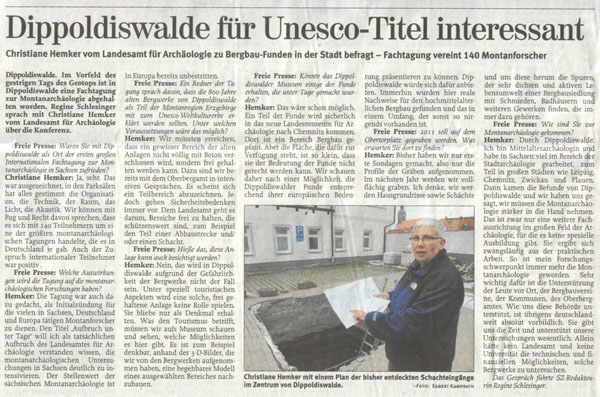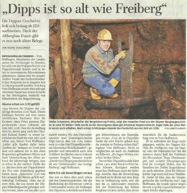 Der ältere Bergbau von Dippoldiswalde Als Stadt wird Dipps (in sächsischer Mundart wird nur "Dipps" zu Dippoldiswalde gesagt) erstmalig 1218 in einer Urkunde genannt. In erwähnter Urkunde tritt ein Pfarrer namens „Johannes de Dipoldiswalde“ als Zeuge auf. Daher einer ersten schriftlichen Erwähnung des späteren Stadtnamens. Als Stadt direkt wird Dipps erst 1266 als „cives“ erwähnt (was eine Ableitung des lateinischen Wortes „Civitas“ ist und für eine teilweise selbstständige Verwaltungseinheit in einer Herrschaft steht, die aus einem städtischen Zentrum mit Marktrechten bestand – Anm. d. Redaktion). Hintergrund war der Streit zwischen Freiberger und Dippoldiswalder Bürgern zwecks Belieferung der Bergwerke mit Bier unter Markgraf Heinrich dem Erlauchten. Dieser Streit, auch als „Bierstreit“ bekannt ist zugunsten Freibergs beigelegt worden. Wobei nicht erwähnt wurde um welche Bergwerke es genau ging. Auch lag dieser Streit schon einige Jahre zurück! Für die Bezeichnung „cives“ war in damaliger Zeit auch die entsprechende Infrastruktur und Wichtigkeit erforderlich die solch ein Privileg überhaupt rechtfertigte. Die Annahme das es sich hierbei um einen Zeitraum von hundert und mehr Jahren zwischen konstanter dauerhafter Erstbesiedlung und der Erteilung des Stadtrechtes handeln könnte wird durch Ausgrabungen von Keramik und das Datieren von Holzfunden getragen. So soll nach den bisher veröffentlichten dendrochronologischer Untersuchungen die konstante dauerhafte Besiedlung um 1155/1159 eingesetzt haben. Dafür beprobte man in den Bergwerken gefundene Hölzer und zog diesen Schluß. Das LfA geht davon aus das diese Hölzer „temporär“ verwendet worden. Also erst zu „anderen Zwecken“ und dann im Bergwerk eingesetzt worden. Erkennbar ist wohl nur der einzige Hintergrund dieses Denkens um die Gründung von Dipps als Waldhufendorf zu deklarieren und somit einem frühen Bergbaubeginn aufgrund von nicht näher definierten Vorgaben zu „vermeiden“! Es ist vollkommen unlogisch erst „anderweitig“ eingesetzte Hölzer dann im Bergbau zu verwenden. Es ist eher umgedreht das sich die Siedlung durch den Bergbau und von einer Bergbausiedlung hin zu einer Stadt entwickelte. Die im Südwesten der Stadt anhand eines Stadtplanes nachgewiesene Waldhufenflur kann parallel entstanden und sich bis weit in die Stadtentwicklung als solche erhalten haben, wie bei anderen sächsischen Städten auch! Um 1289 erscheint wieder die Bezeichnung „opidum“ in einer Urkunde und bezeichnet was als „Stadt“ deutbar ist, aber nicht die Rechte einer Stadt besitzt. Der Bergbau zu Dippoldiswalde wird erst 1300 urkundlich erwähnt. Dafür steht ein „Diplom“ von Friedrich Klemm, dem „Markgrafen von Dresden“. Über den Bergbau von Dipps schweigen lange Zeit die Überlieferungen. Nachweislich durch die archäologischen Untersuchungen ist aber eine Bergbautätigkeit über einen langen Zeitraum nachweisbar. Selbst im Lehnbuch „Friedrichs des Strengen“ von 1349/50 ist nichts zu Dipps auffindbar. Erst 1366 erscheint der Name Dipps wieder in Zusammenhang mit dem dortigen Bergbau. Die Markgrafen verlehnten die Bergwerke von Dipps an Otto Heide von Dohna. Die sogenannte „Dohnaer Fete“ von 1401/02 brachte die Markgrafen von Meissen wieder in den Besitz von Dippoldiswalde und der dort betriebenen Bergwerke. Der Nachweis hierfür sind 3 Münzmeisterrechnungen von 1401 – 1405. Die Bergwerke von Dipps sind hier ausdrücklich erwähnt, als klein bezeichnet und erbrachten keine Ausbeute.