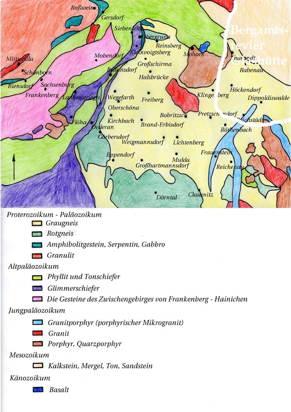 Im unmittelbaren Bergbaugebiet sind als Grundgebirge vorwiegend Gneise verschiedener Art zu finden. Dabei überwiegen die grauen Biotitgneise der unteren und oberen Stufe. Rotgneise oder Muskovitgneise sind eher selten und kommen nur in der Nähe von Sadisdorf, Bärenburg und dem Pöbeltal vor. Für den Bergbau auf Metallerze sind nur die Gneisgebiete interessant, denn nur hier haben sich  bauwürdige Erzgänge ausgebildet. Die Gneisgebiete grenzen im Süden und Osten an die Teplitzer Quarzporphyrdecke, im Westen an den Frauenstein – Dippoldiswalder Granitporphyrzug und zuletzt nördlich an dicke kreidezeitliche Sedimentablagerungen die den Gneis überdecken. Das Gneisgebiet wird überall von gering mächtigen bis stark hervortretenden Porphyrgängen gestört. Es handelt sich dabei um Granitporphyre und Quarzporphyre, wobei die letzteren immer am Granitporphyr abschneiden und somit wesentlich jünger sind. Auch sind zwei mächtige Basaltdurchbrüche in diesem Gebiet äußerst auffällig. Zum einen handelt es sich um den Luchberg in der Nähe von Dippoldiswalde und den Willisch bei Kreischa. Beide sind als Berge in der Landschaft unübersehbar.