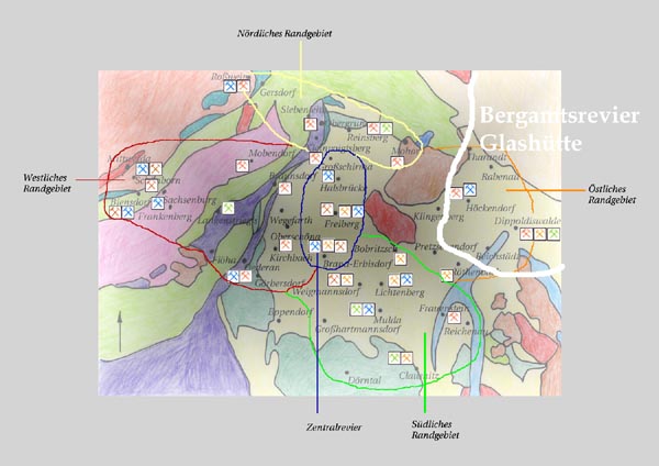 Weiß umrandet sind die geologischen Bereiche, die teilweise oder dauerhaft zum Bergamtsrevier Glashütte gehört haben.