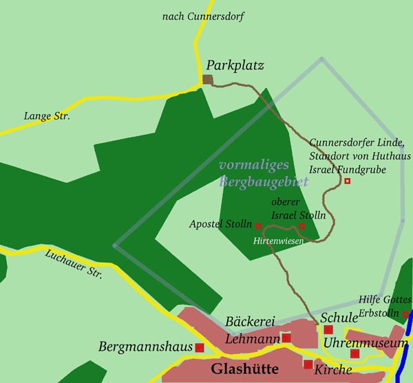 Außer den Pingen sind auch viele markante Punkte im Gelände sichtbar, die auf verlassene Gruben verweisen. Einige davon konnten durch die Recherchen der Glashütter Bergbaufreunde auch wieder Namen zugeordnet werden.