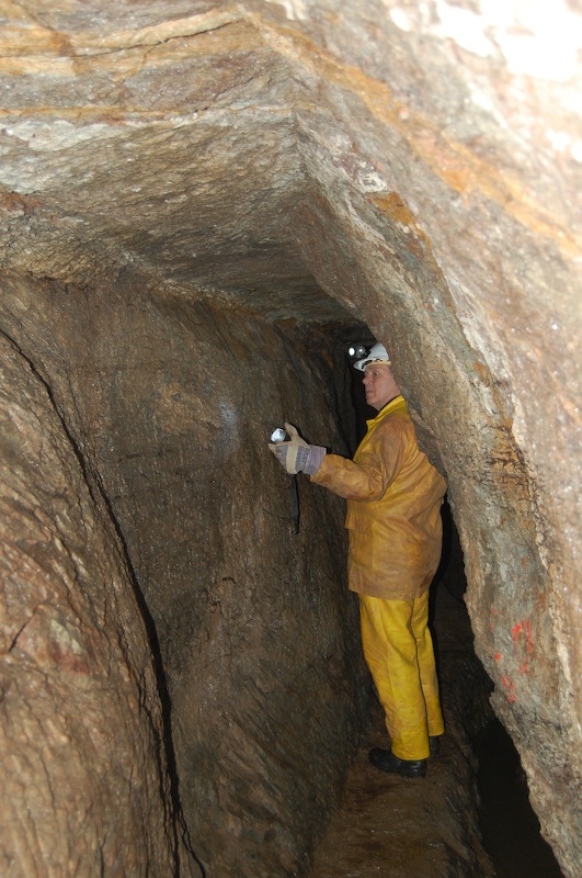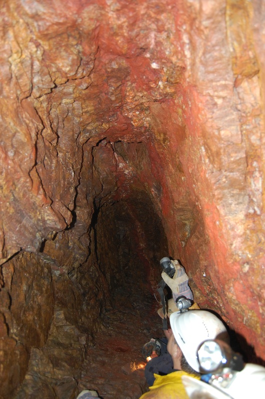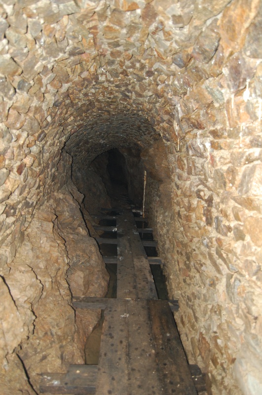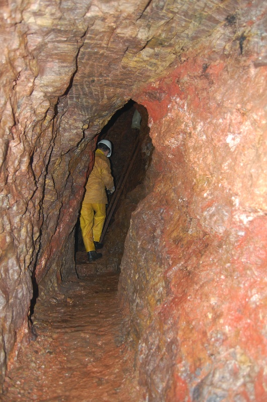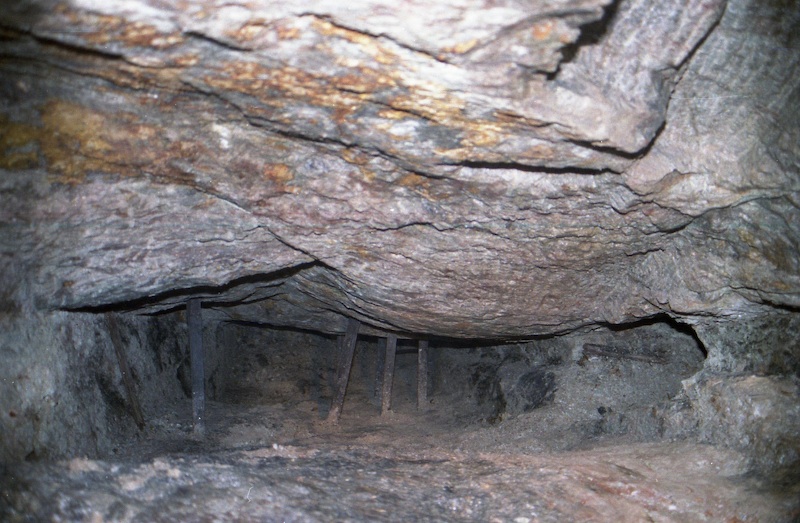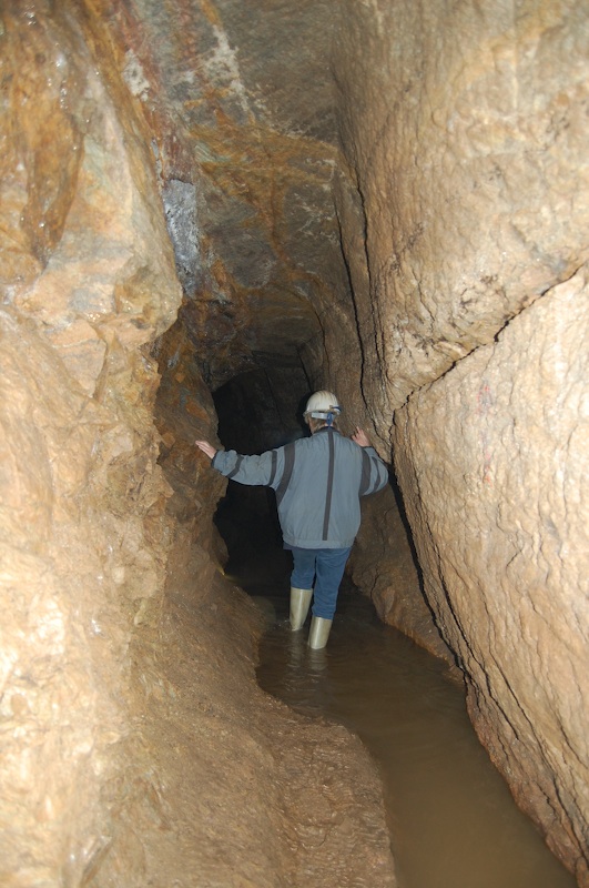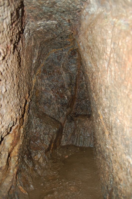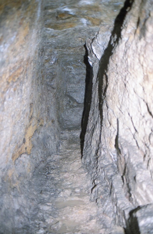 Geschlägelte Strecke auf einem Gang im typischen Profil des mittelalterlichen Bergbaus. Hier der Übergang von tonnenförmiger Firste in eine gerade Firste. Letztere resultiert aus einem Streckennachriss.