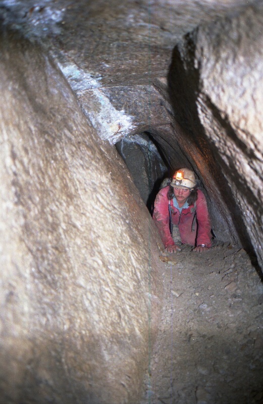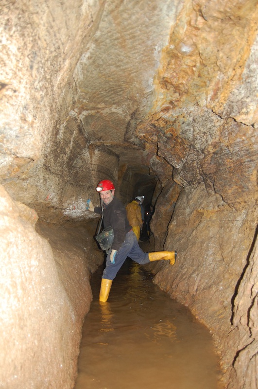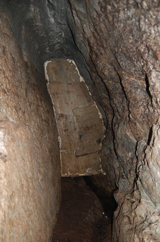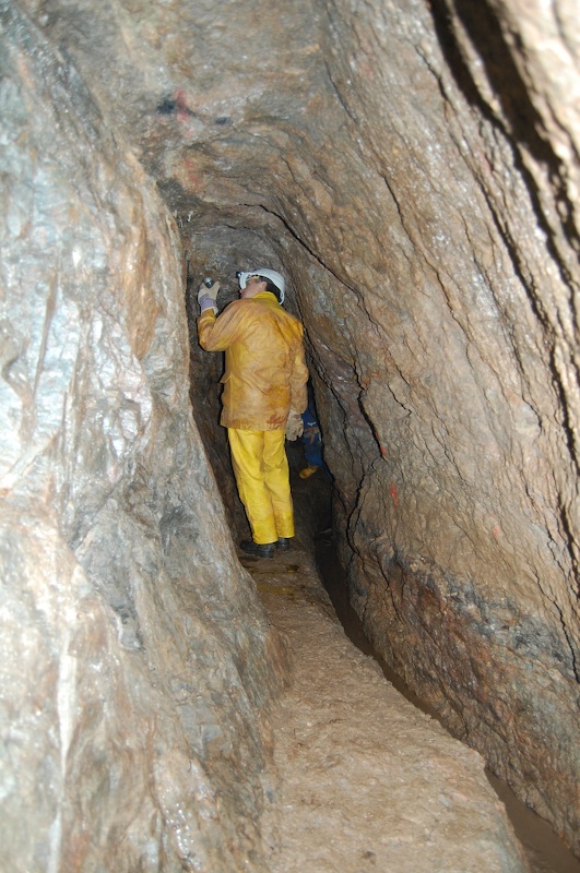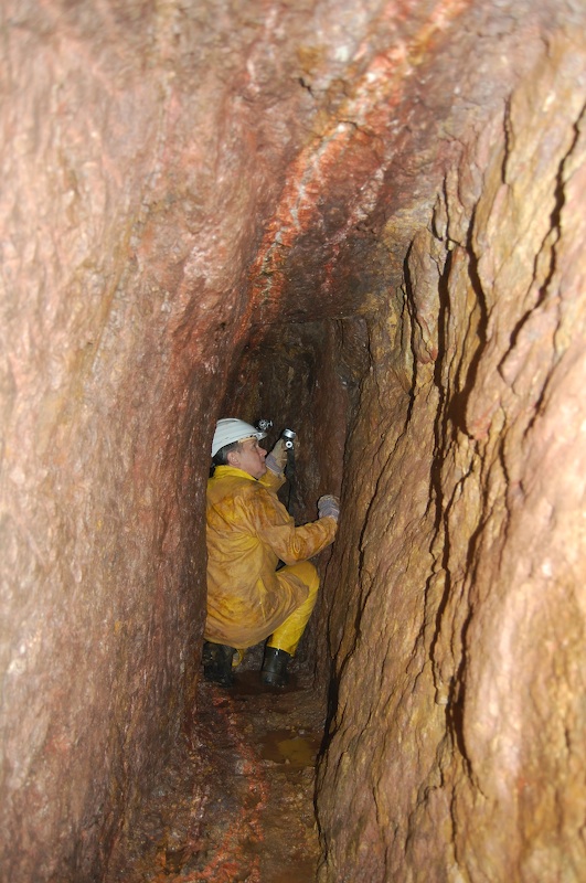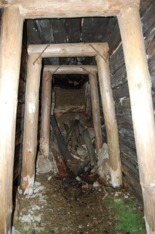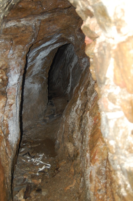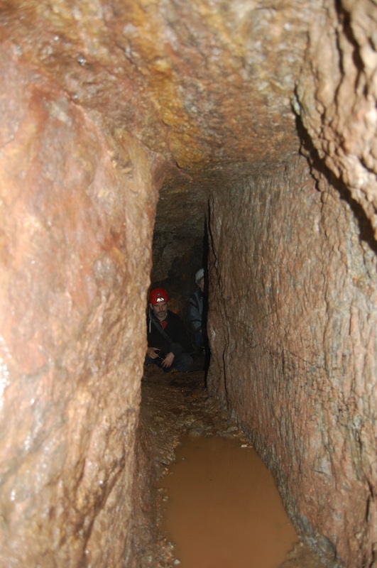 Geschlägelte Strecke auf einem Gang im typischen Profil des mittelalterlichen Bergbaus. Hier der Übergang von tonnenförmiger Firste in eine gerade Firste. Letztere resultiert aus einem Streckennachriss.