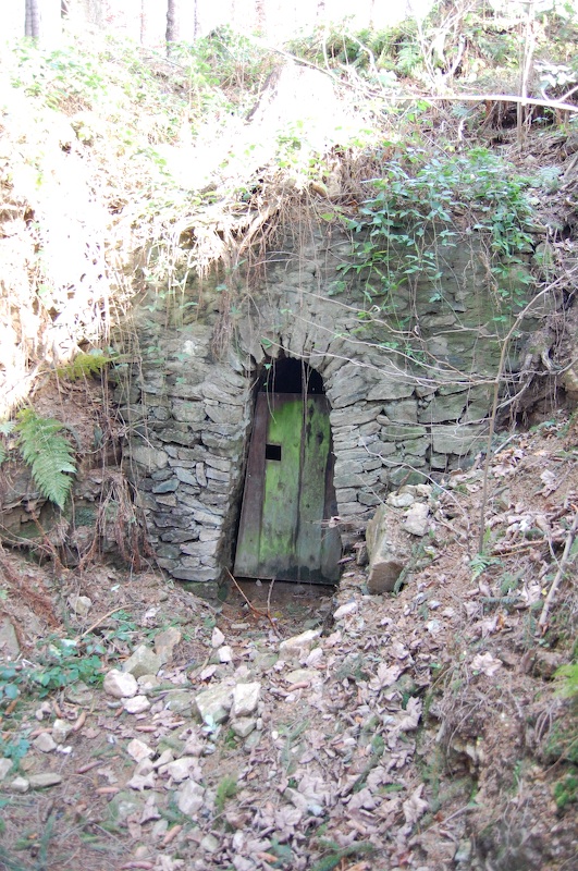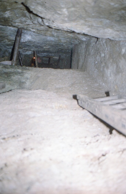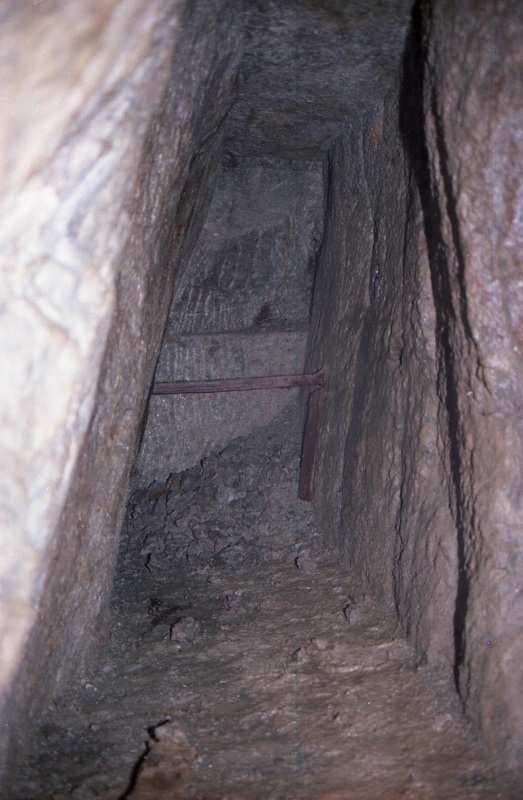 Über einen abgestuften Schacht, in diesem Falle der unterste Schacht, gelangt man auf die nächst höher gelegene Strecke. Diese führt dann zum verfüllten Tagesschacht.