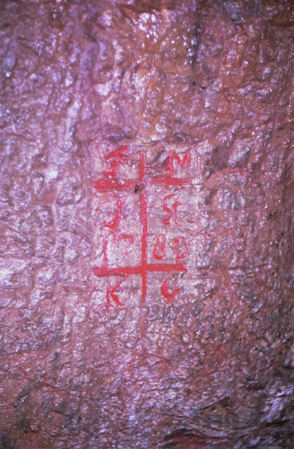 Verstufungstafel mit der Jahreszahl 1789 in Nähe des Handpumpenkunstschachtes. Wir hatten die eingeschlagene Jahreszahl zunächst falsch als 1780 gedeutet...