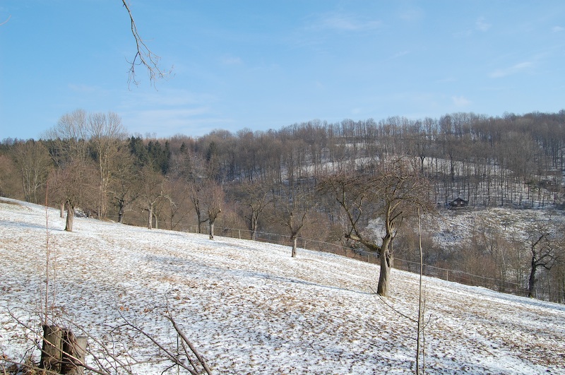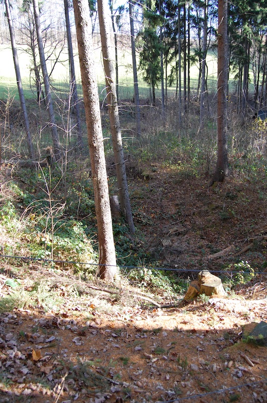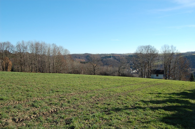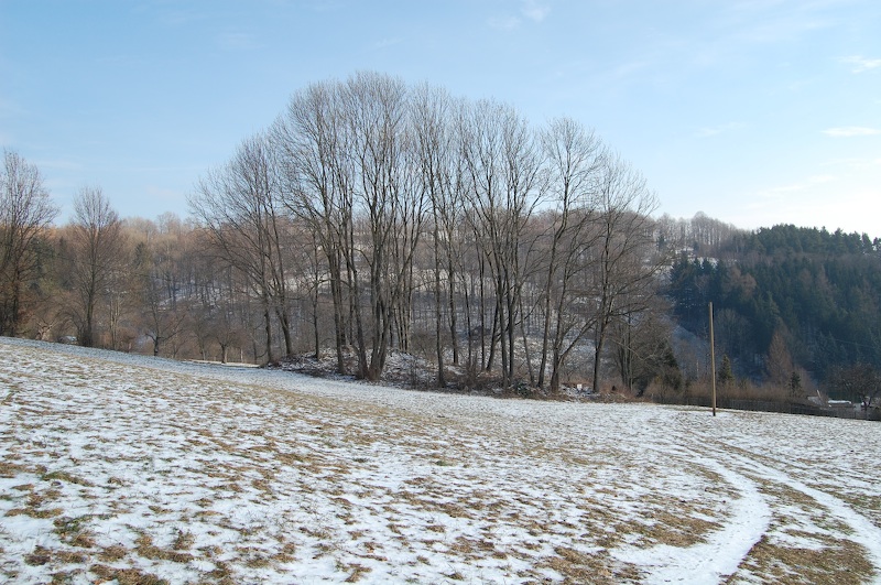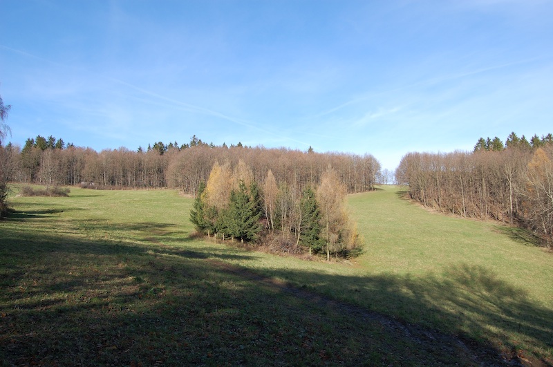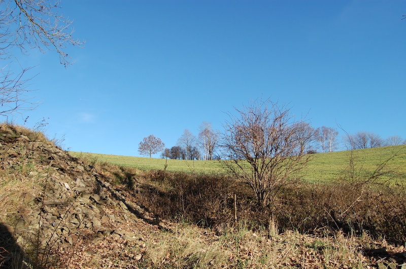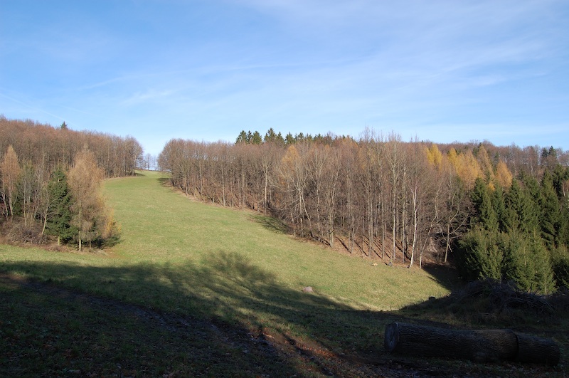 Einzeln stehende Baumgruppen deuten hier immer alte Schachthalden an, wie hier weiter aufwärts im Bergbaugebiet Hirtenwiese.