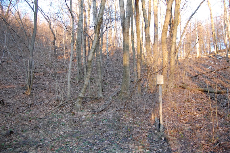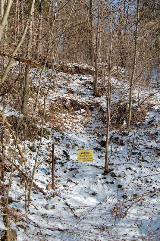 Lage des verfüllten Mundloches vom oberen Israel Stolln am Bergbauwanderweg. Ein Schild verweist auf diese Stelle.