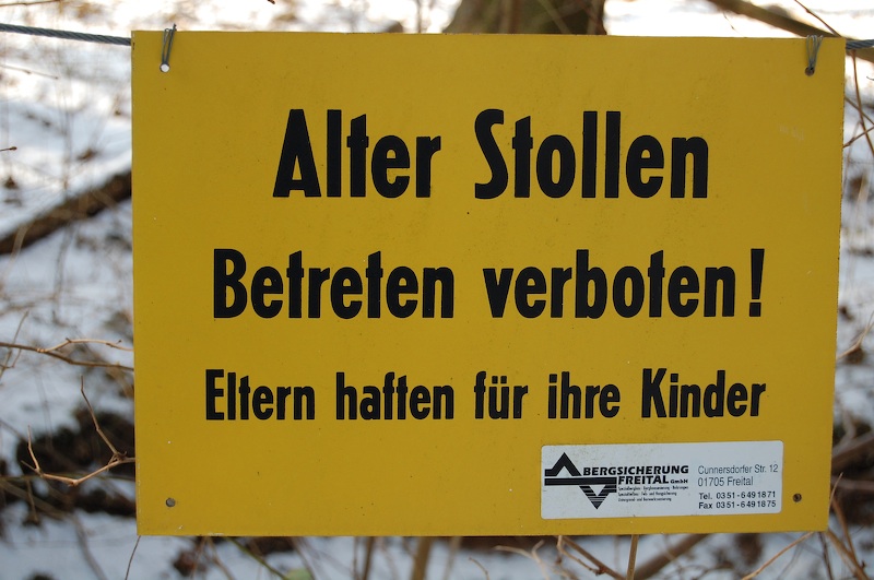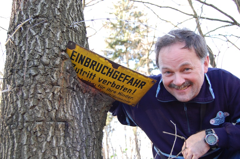 Nahezu ein Vierteljahrhundert benötigte der Baum um sich dieses Verbotsschild einzuverleiben! Das Schild gehörte zu einer Einzäunung eines Schachtes aus der Zeit der SAG Wismut aus den 1950er Jahren. Über die Tätigkeit der Wismut in diesem Gebiet ist so gut wie nichts bekannt.