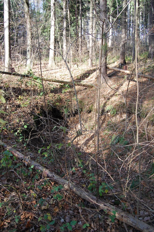 Mächtige Pingen auf dem Wolfgang Stehenden, durch den oberen Jakob Stolln erschlossen, im Bereich des Handpumpenkunstschachtes.