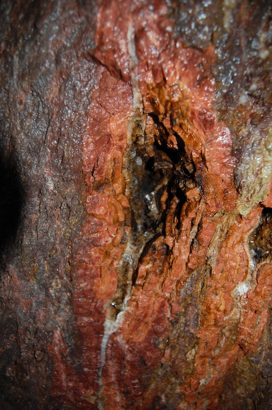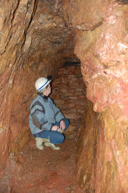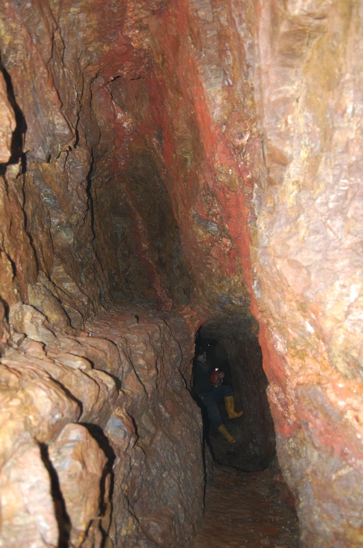 Übergang von Stolln in einen kleinen Abbau. Wieder rot hervortretend, der Barytgang.