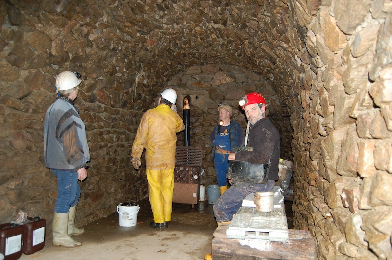 Zum Schluss noch einen Abstecher in den neben den Stolln gemauerten Mettenschichtraum der Glashütter Bergbaufreunde. Bemerkenswert ist die untertägige Ofenheizung des Raumes.