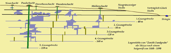 Vom mittelalterlichen Bergbau zum modernen Bergbaubetrieb Erst um 1873 rührte sich wieder etwas im Grubenfeld von „Dorothea Ersbstolln“. Die Consolodierung der um 1868 entstandenen „Große Hoffnung Fundgrube“ mit „Dorothea Erbstolln“ eine neue kräftige Bergbauunternehmung unter dem Namen „Zenith Fundgrube“. Die Federführung übernahm dabei der Hamburger Kaufmann J. Heidtmann. Dabei sind die Grubenfelder von „Unverhoffter Segen Gottes Erbstolln“ und „Dorothea Stolln“, sowie einiger weiterer kleinerer Gruben in die neue Unternehmung eingeflossen und umfassten 54 ha Fläche. Ebenso sämtliche vorhandene Gebäude und Aufbereitungsanlagen gehörten von nun an mit zur Unternehmung. Der Grubenbetrieb ging dabei auf relativ „kleiner Flamme“ um. Meist wurden die im Bereich des Hauptstolln liegenden noch nicht abgebauten Erzvorräte Ziel der Unternehmung. Unter das Stollnniveau erreichte man nur Bereiche die mit „menschlicher Wasserhaltung“ möglich waren, dafür wurden Handpumpen eingesetzt.